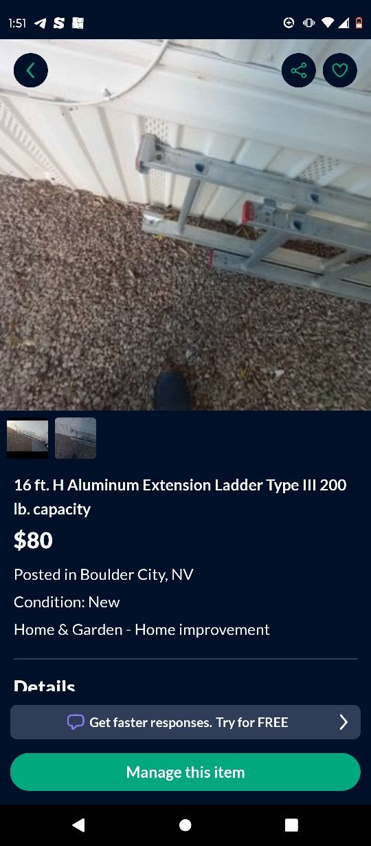 16 ft. H Aluminum Extension Ladder Type III 200 lb. capacity