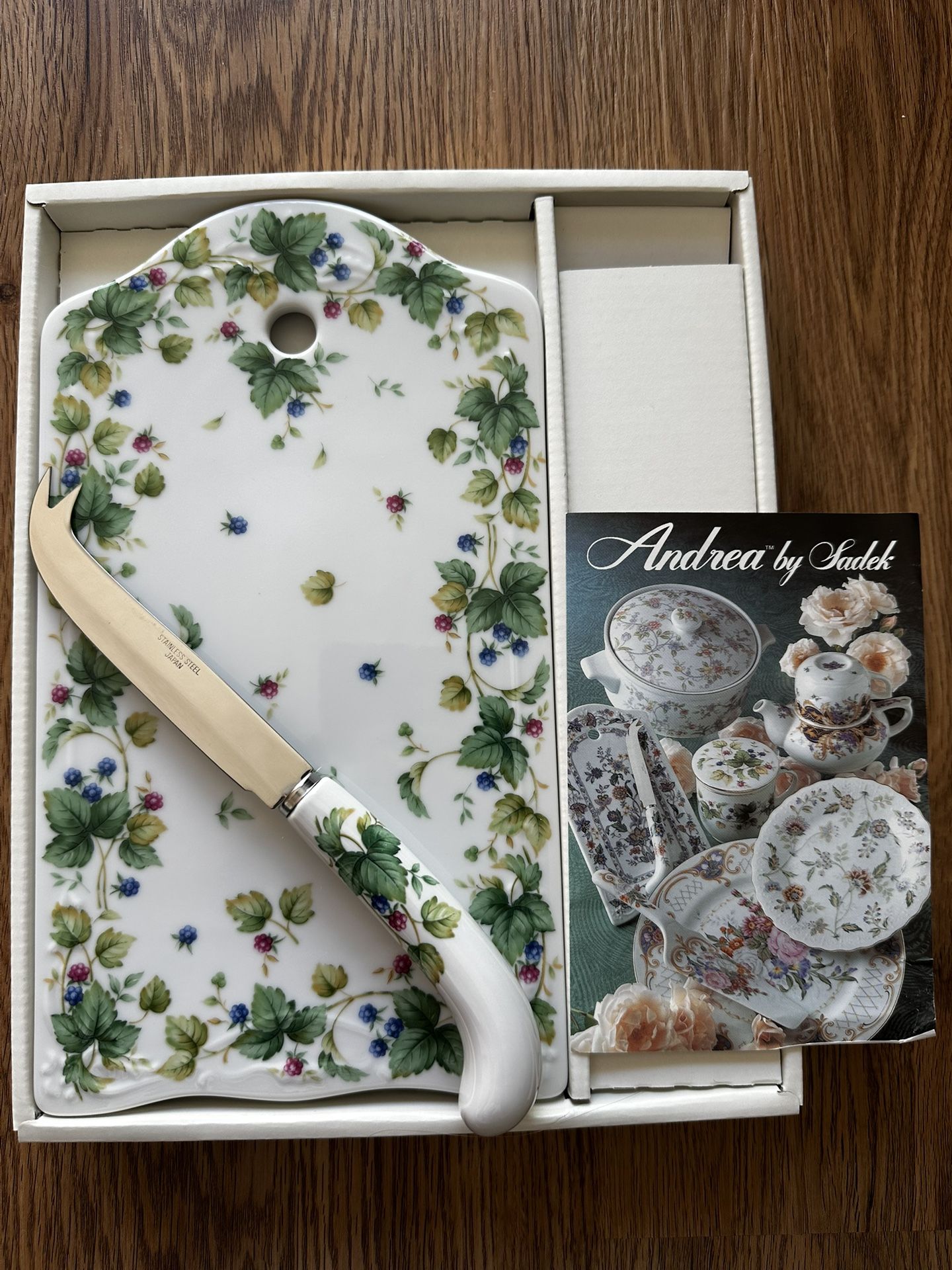 Floral design porcelain cheese board (about 9.5x5.5 inches) with knife by Andrea Sadek, made in Japan. Please be able to pick up from Culver City/Palms area. Thanks! Plus! Free set of 4 mugs.