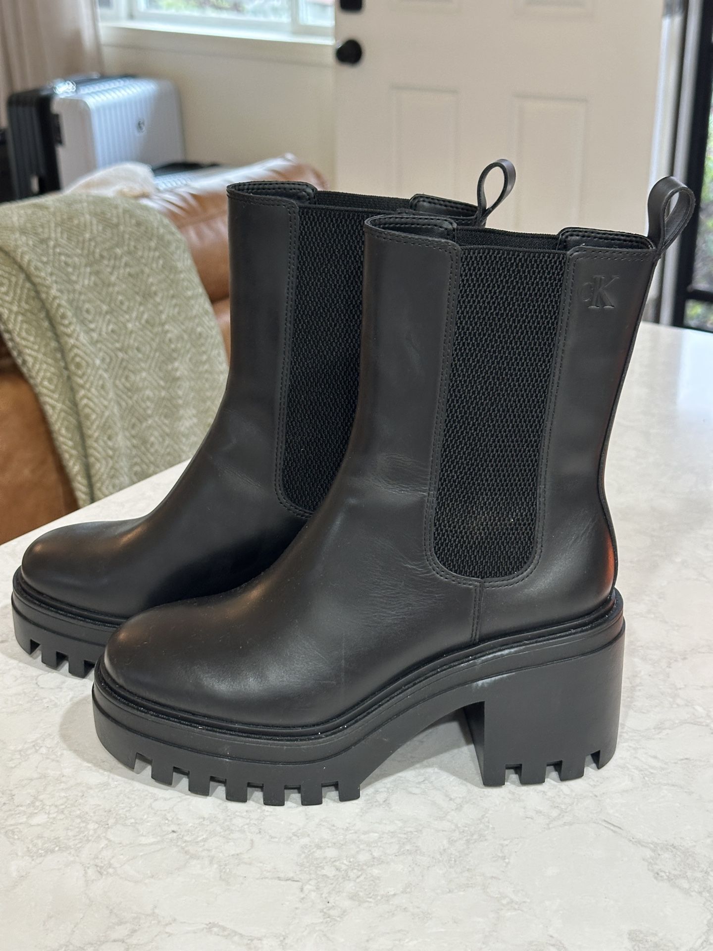 Modern Calvin Klein Jeans chunky heeled Chelsea boots with elastic side panels and a bold lug sole. Sleek black leather - never worn, very versatile and on-trend. Details: Women’s US 8.5 / EU 39 Chunky heel & lug sole Chelsea boot style Leather upper Original retail: ~$250