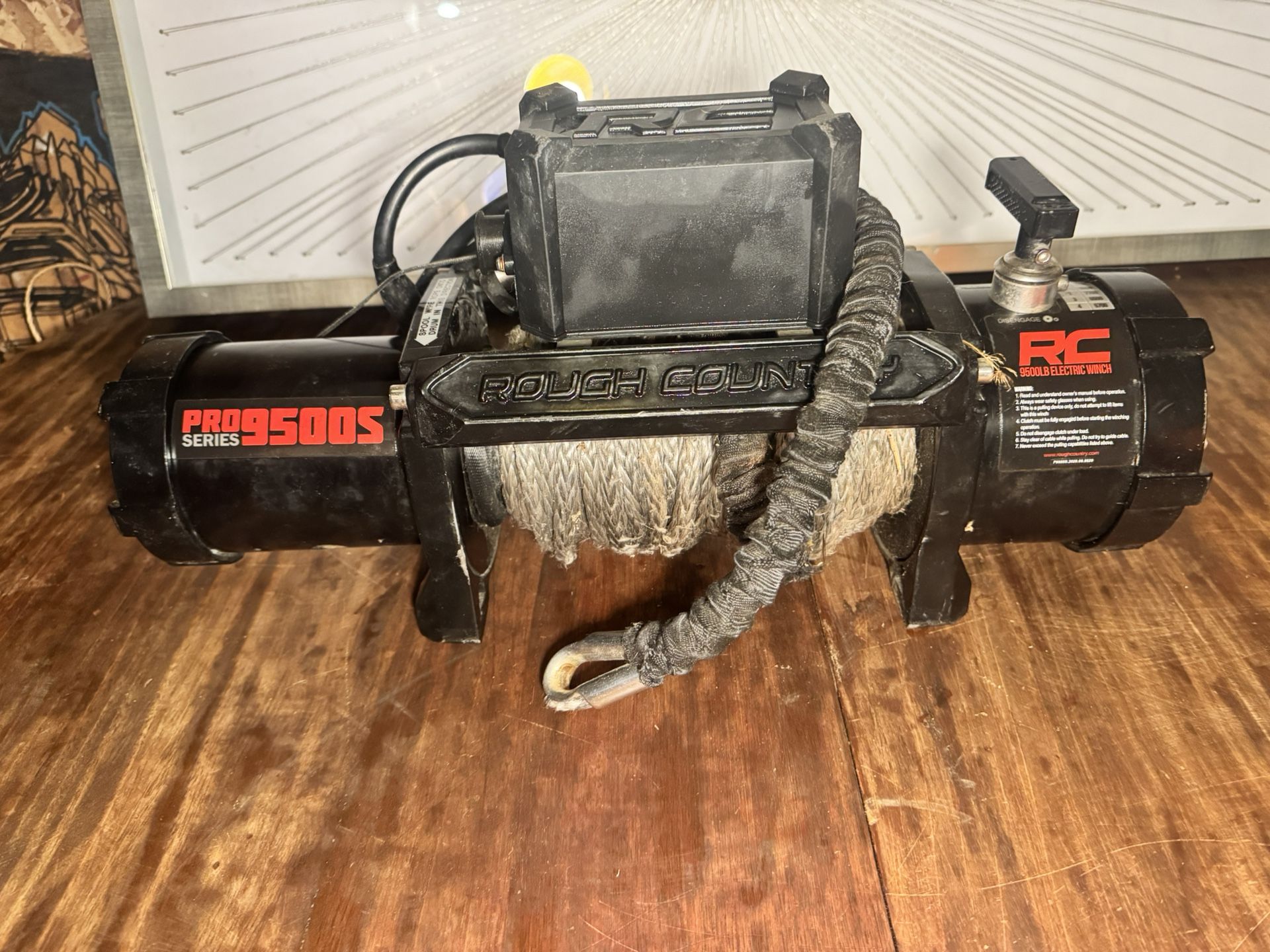 Rough Country Pro9500S Series 9,500 lb electric recovery winch. Includes winch, synthetic rope, control box, wiring, and fairlead as shown. This is a vehicle recovery winch commonly used on Jeeps and trucks. Unit shows clear signs of use. Control box housing is cracked, and synthetic rope is worn from normal use. Because of this, the winch is being sold as-is. I have not tested it under load. Recommend for: • Off-road project build • Trail spare • Repair / rebuild • Parts Sold as-is, priced accordingly. ⸻ Details • Brand: Rough Country • Model: Pro9500S Series • Capacity: 9,500 lb • Synthetic rope • Typical Jeep / truck recovery winch ⸻ Pickup Local pickup only. White Center Cash or app p