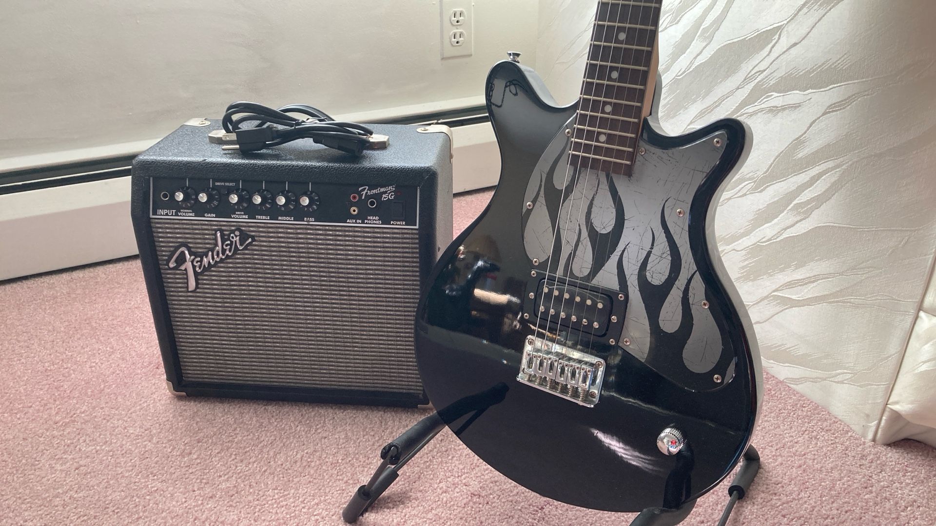 First Act ME 1980 Double Cut Electric Guitar A very cool guitar in like new condition, smooth neck with a beautiful Rosewood Fretboard Fender Frontman 15G Features: Solid State Output 15 watts into 8 ohms 8" Fender Special Design Speaker Channels - Dual Selectable Channels (Normal and Drive) 3-Band EQ Headphone Jack Auxiliary Input for CD, Tape, or Drum Machine Closed Back Blackface Styling with Silver Grille Cloth Covering: Black Textured Vinyl with Silver Grille Cloth I have several amplifiers if your looking for something different Guitar Trades Considered