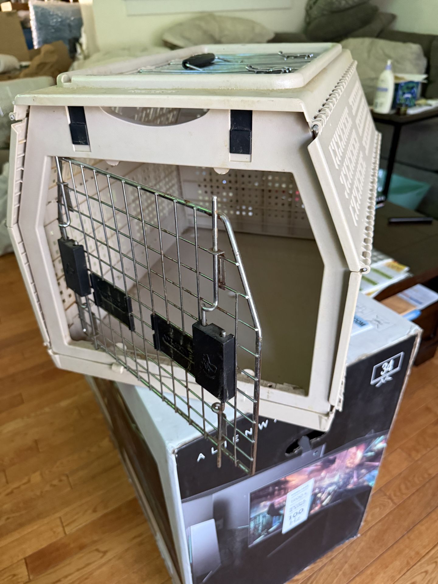 Foldable pet carrier. Has metal door with secure latches. Top metal grate for ventilation or accessories. Folds down for easy storage. In perfect condition CASH ONLY!