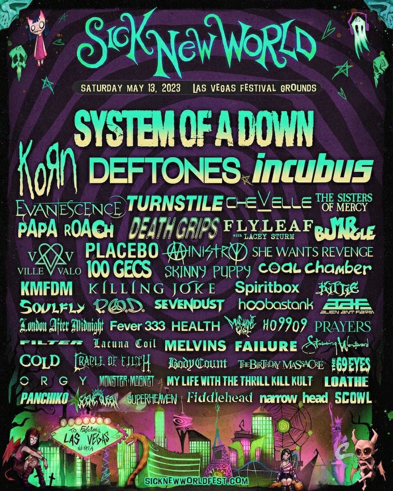 Selling TWO (2) TIER TWO Sick New World Festival. Taking place at the Las Vegas Festival Grounds on May 13, 2023, the inaugural Sick New World Festival boasts a stacked lineup of bands from the hard rock and al genres including: headliners System Of A Down, Korn, Deftones and Incubus — along with over 50 artists including Evanescence, Turnstile, Chevelle, Mr. Bungle, Papa Roach, Death Grips, Flyleaf, Placebo, HO9909, Melvins, HEALTH, Spiritbox, Failure, The Sisters of Mercy and a lot more.