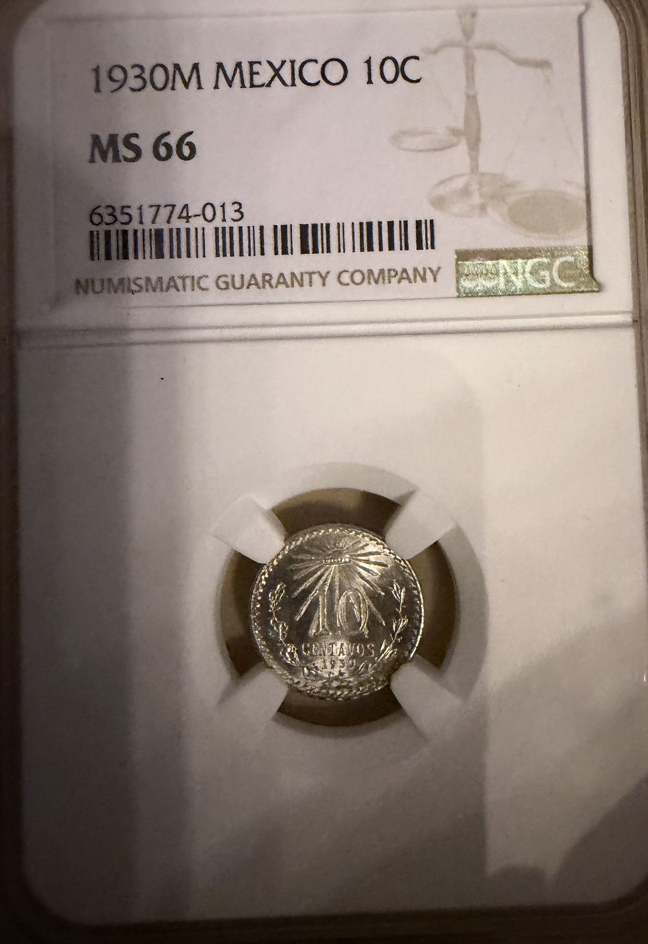 📌 Coin Basics • Issue: Mexico, 10 Centavos (KM-431) • Year: 1930-M (Mexico City Mint) 96 years old • Metal: Silver Mexican high grade • Diameter: ~15 mm • Design: • Obverse: Radiant liberty cap with denomination below • Reverse: Wreath encircling value and date  ⸻ 🏆 NGC MS66 – What It Means • MS66 is a Gem Uncirculated grade — very clean, strong luster, minimal marks. • Coins at MS66 are scarce for this issue compared to lower grades, especially at world-coin price levels.