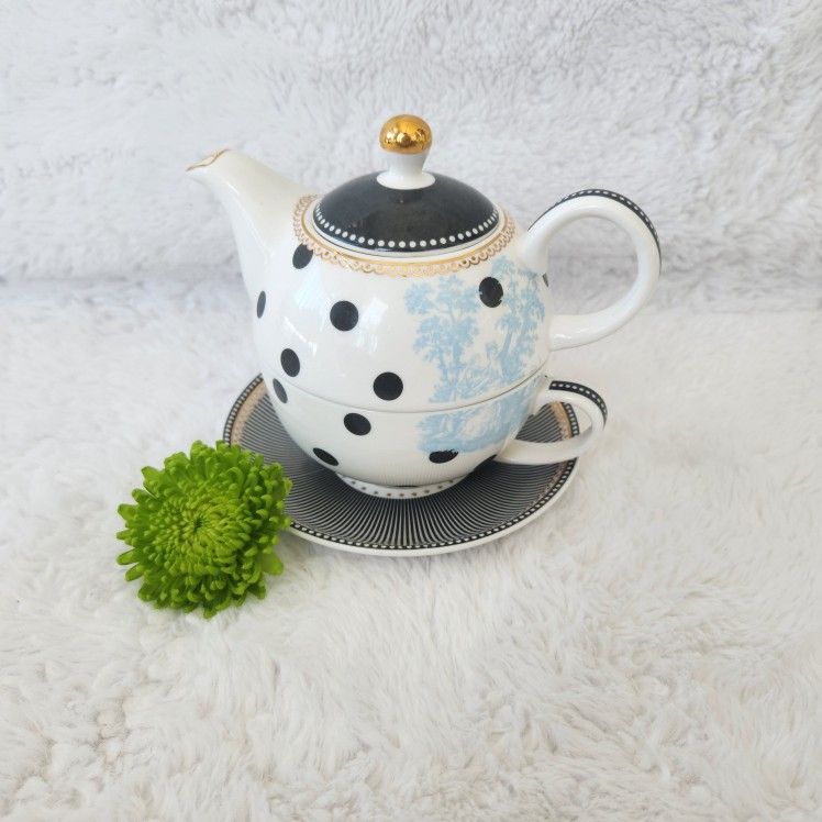 Elegant porcelain tea-for-one set featuring a charming black and white polka dot design with delicate blue accents and gold detailing. Includes a teapot, matching cup, and saucer. Perfect for tea lovers or as a unique gift. Price: $10 Great Condition Clermont, Fl