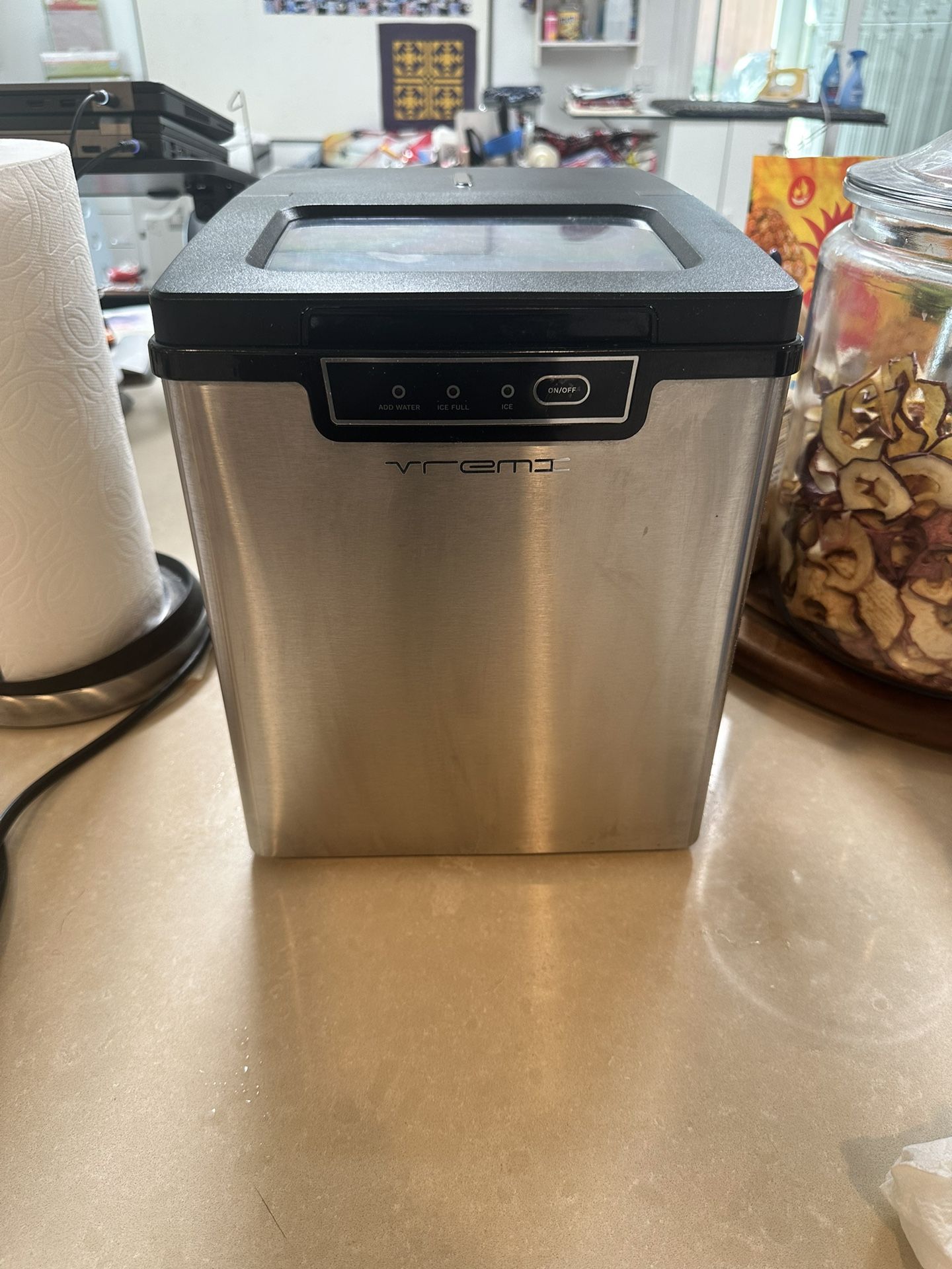 Vremi brand. Works great, just moved and no longer need it. Includes plastic ice scoop.