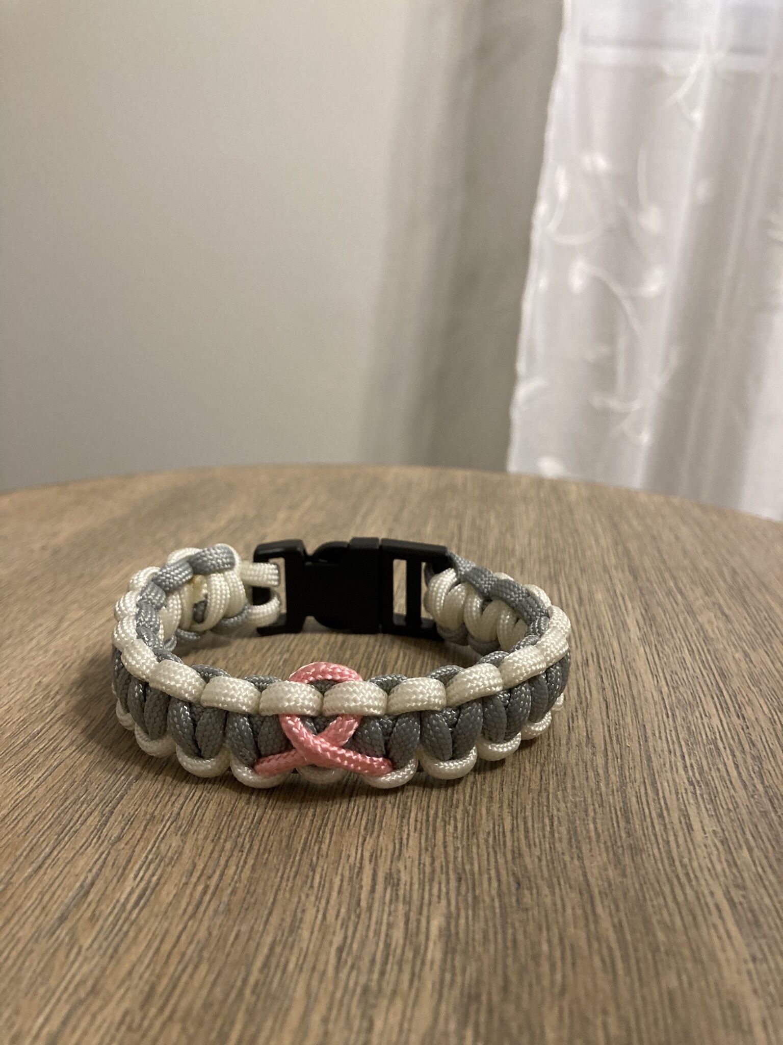 550 Paracord breast cancer bracelet 8” unisex. Plastic clip Color: white edge, gray center with pink ribbon Hand made by me