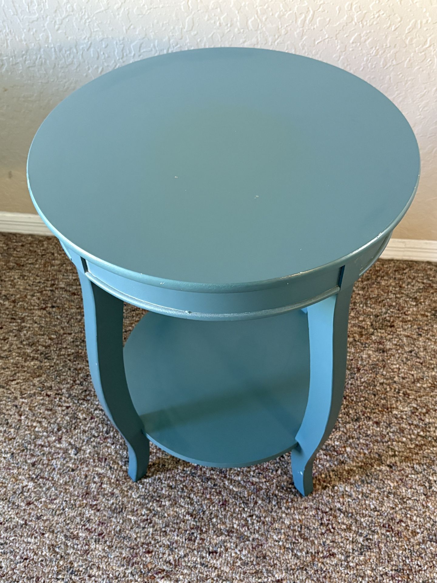 Fully functional end table in a muted teal (blue-green) finish. Measures approximately 24 inches in height and 18 inches in width. Sturdy and well-made, featuring a round tabletop and a lower shelf for added storage or décor. Shows minor cosmetic wear from normal use, including a small paint chip on the back, which does not affect stability or function. Overall clean, solid, and in good condition.