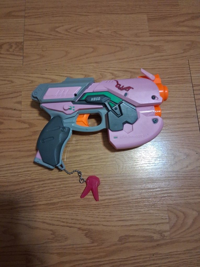 Official Overwatch Dva nerf Gun. Includes the dva charm attached to the gun too. $35obo. Item is pre-owned, I bought it online for a halloween costume that I decided not to wear. The gun works perfectly. Great condition. Perfect accessory for gamer halloween costume.