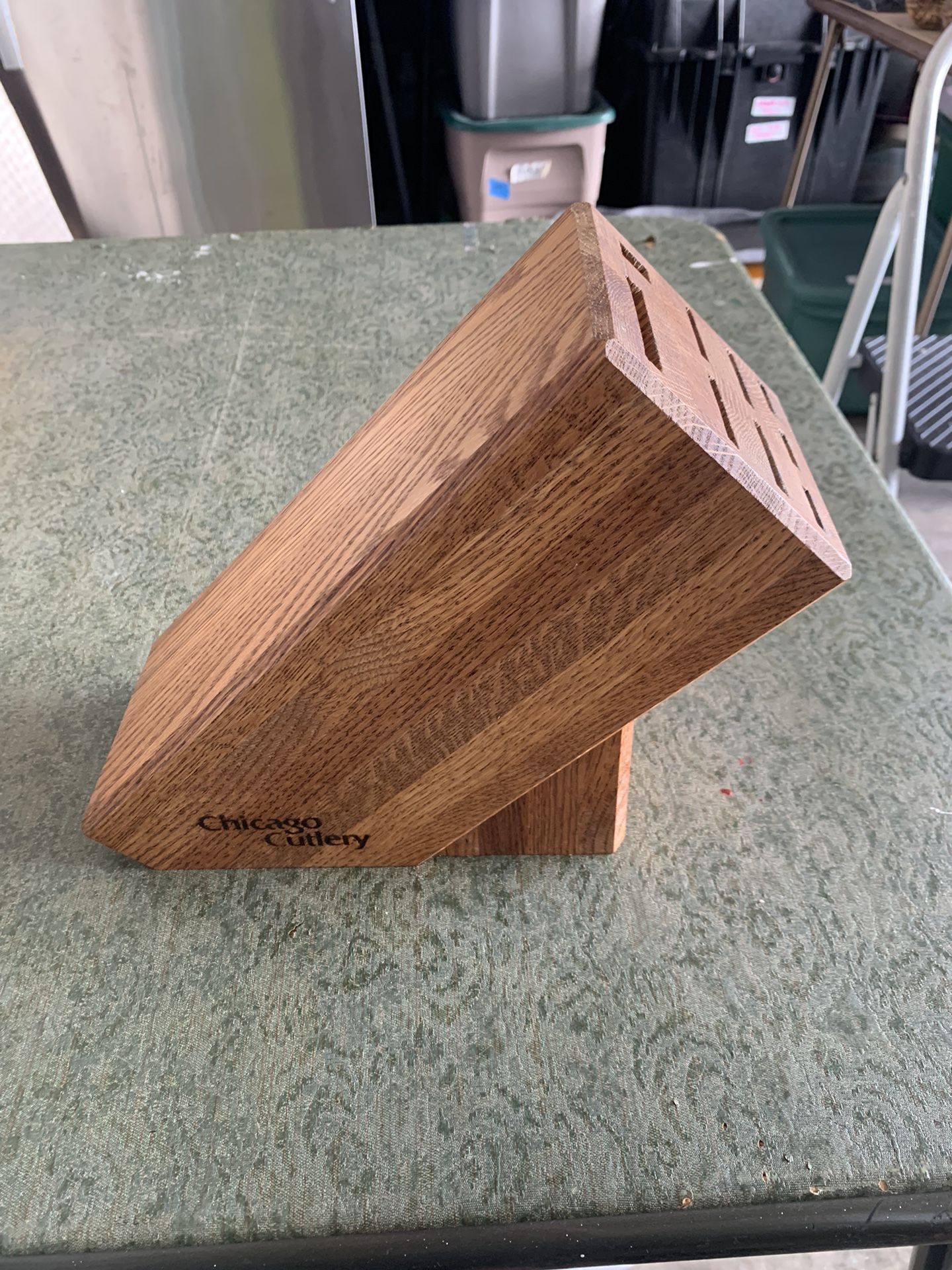 9”H x 4.75”W, holds 8 knives plus a sharpener tool. Great condition. Pick up in Wesley Chapel 33543. Cash only.