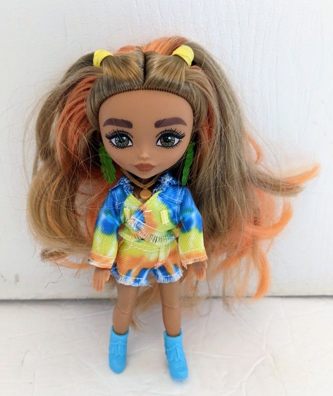 Barbie Extra Minis Tye Dye Doll by Mattel. She's in good condition. She has her clothing, both of her earrings, her necklace and her boots. Her hair is in good condition. Please see photos for full details as they are VERY IMPORTANT to her description. She's from a smoke free home. Thank you so much for stopping by and taking a look.