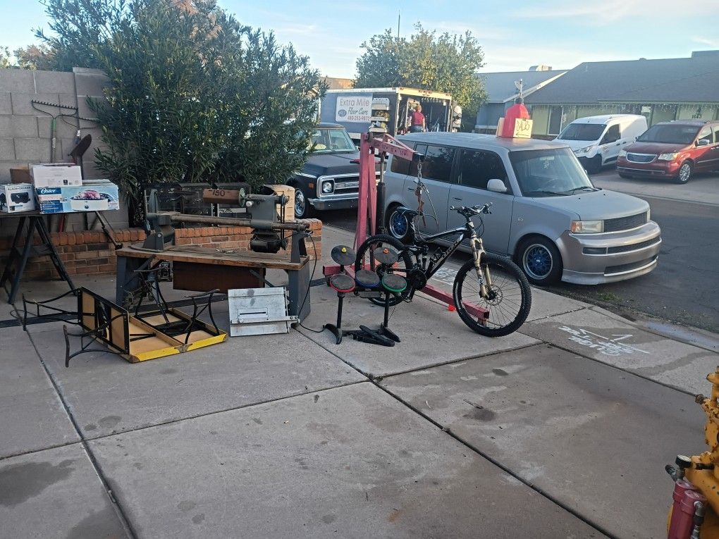 It's a yard sale with a lot of tools big tools woodworking tools automotive tools concrete lamp tools ladders clothing there's also pneumatic tools furniture grills fans race shovels shelves mini refrigerator I got air fryer LG TV for I think I got it marked on there for $10 yeah I got a $10 LG flat screen TV smart TV right here 10 bucks come get it