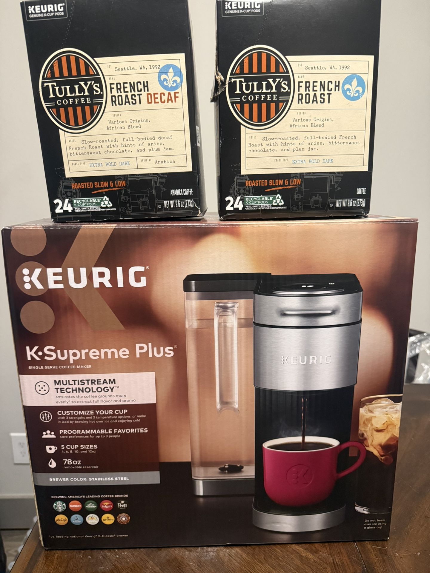 New Keurig Supreme Plus with 2 boxes of Tullys French Roast Decaf Coffee $160...pick up in kent