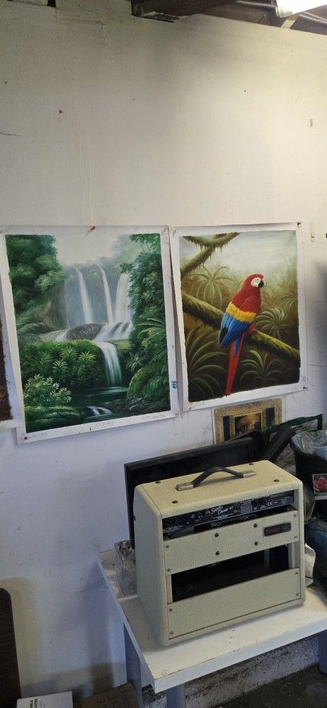 These are hand-painted oil paintings on canvas they measure 2 ft by 3 ft we are selling them for $25 each very firm please no offers we started off with 37 I think we're down to maybe a dozen or so we are also selling 65 sculptures please click on my five stars and scroll down to see them The house is in Costa Mesa we are also interested in trading for a car a truck a van silver dollars or bronze sculptures