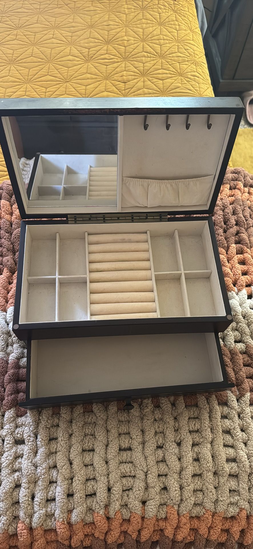 Handy dark wood jewelry box. Has a mirror inside the lid and hooks for necklaces. Lots of compartments for earrings and bracelets. Also has ring rolls for all your rings. Bottom has a pull-out drawer for extra storage. Keeps jewelry organized.