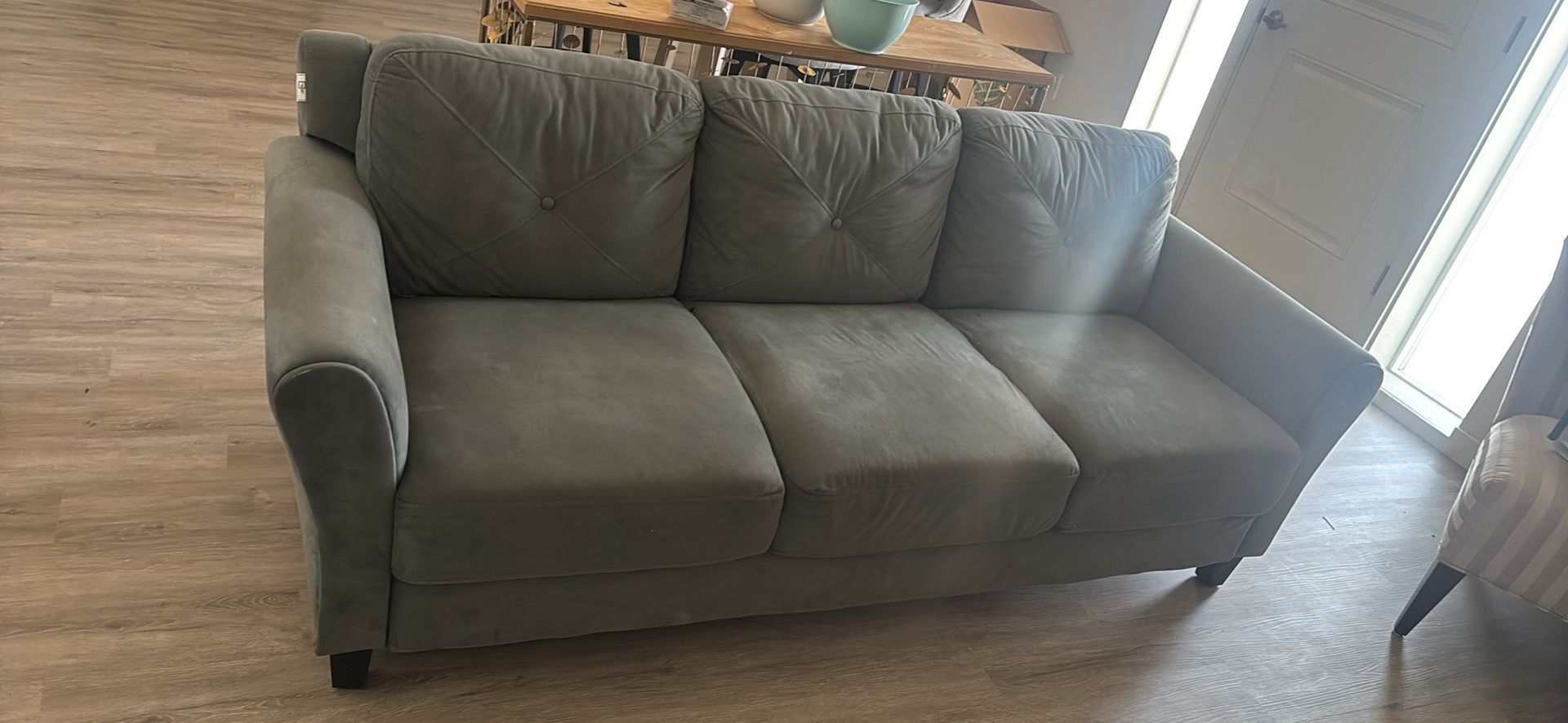 100 each obo Couch is small 80-95 inches can’t remember no rips Tv stand is about 65 inches tv on it is 58inches some scratches shown in the picture I just need both items gone