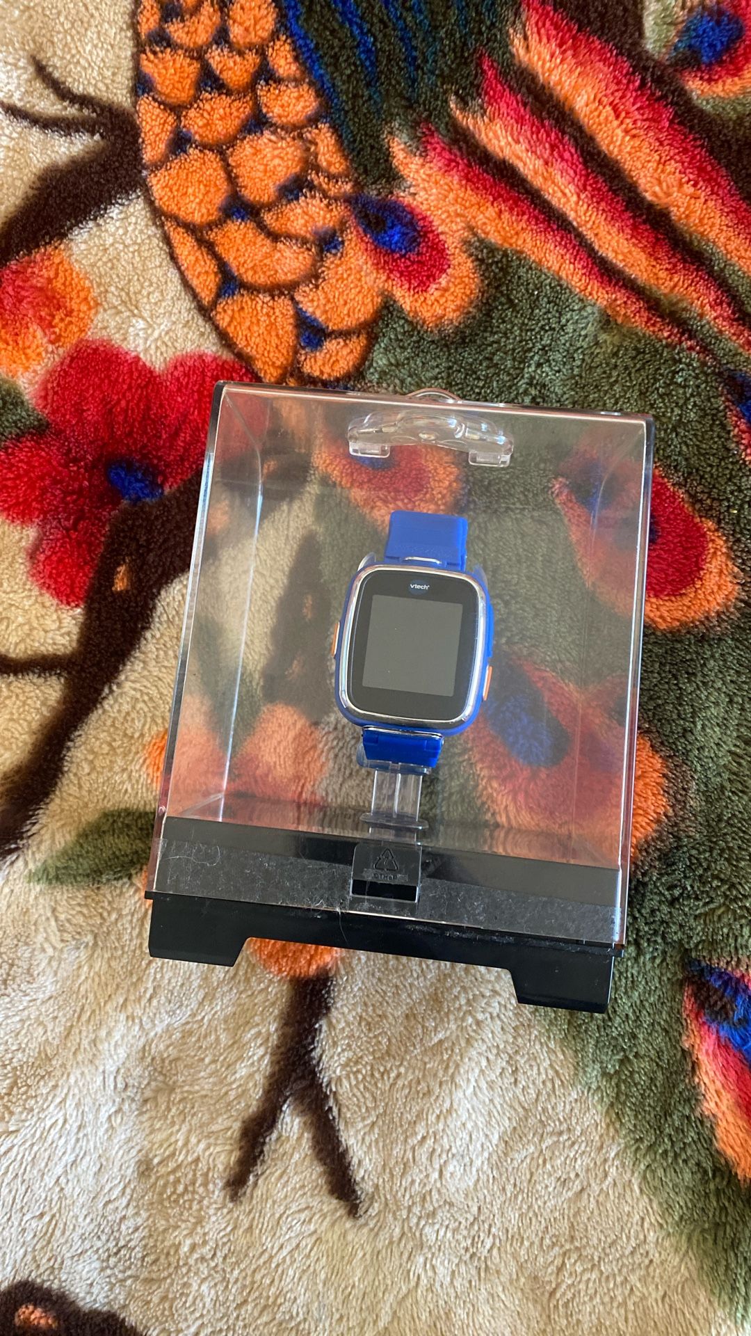 The item is a VTech KidiZoom Smartwatch DX2 in blue. Features two cameras for taking photos and videos, including selfies. Includes over 55 digital and analog customizable watch faces. Has a motion sensor for active games, such as an augmented reality "Monster Detector" game. Functions include an alarm, timer, calendar, and voice recorder.