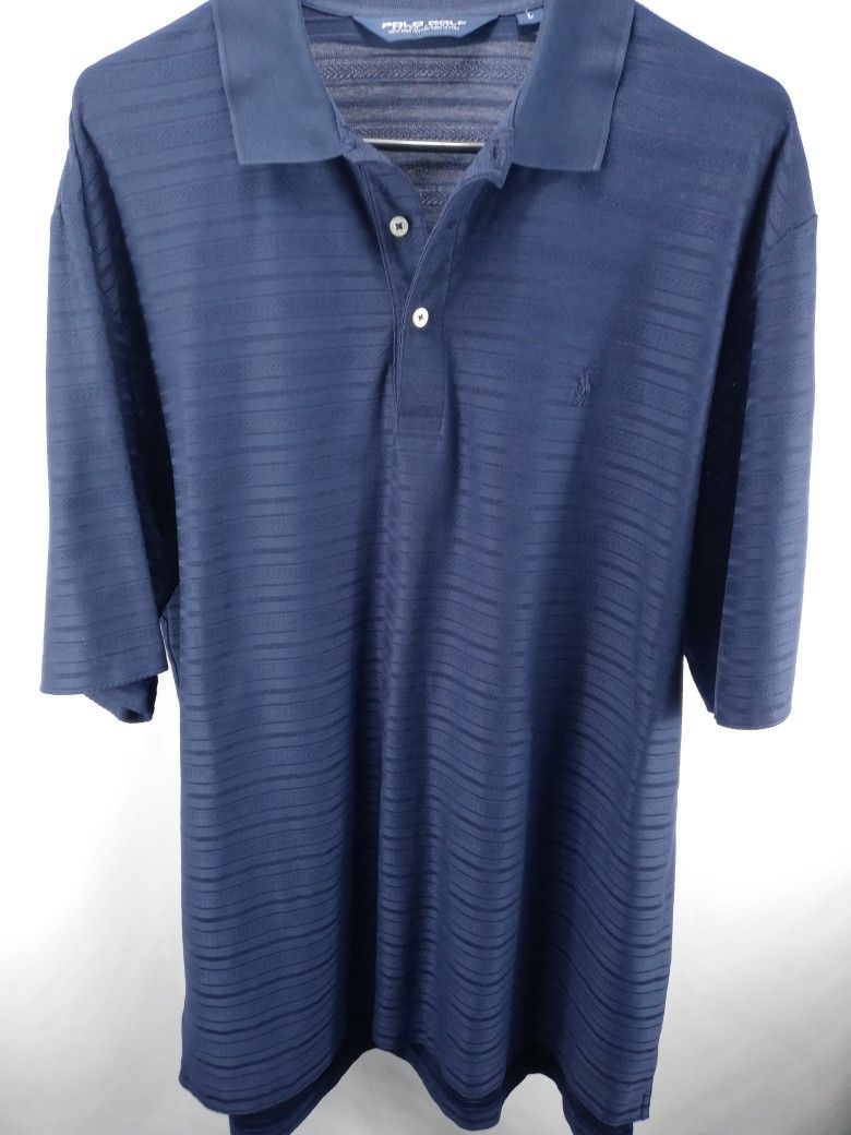 Ralph Lauren Mens Size Large Embossed Polo Golf Shirt. Excellent like new condition no fade polyester cotton blend. Embossed raised striped pattern, signature polo pony logo in blue. Pit to Pit/Chest 25.5" inches (51" inches Total) Shirt Length 32" inches. Msrp $99