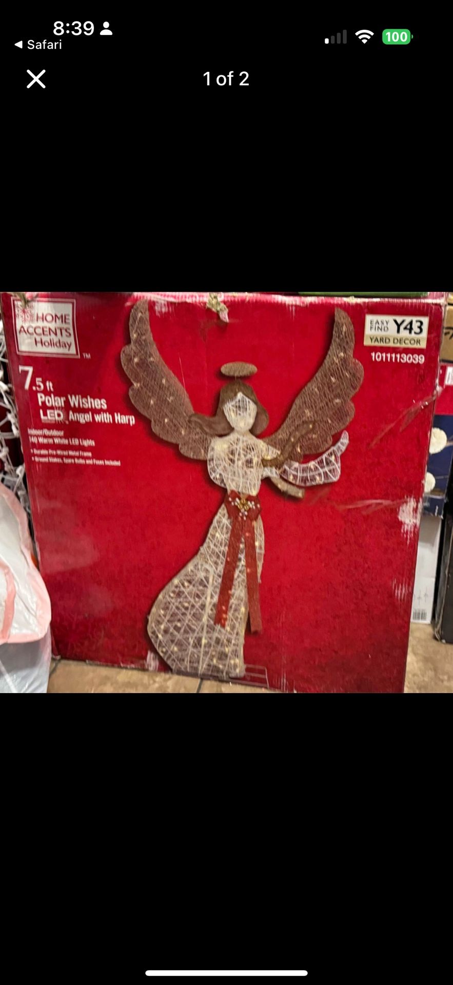 Create a festive Christmas display with this 7.5 ft. Polar Wishes LED Angel with Harp from Home Accents Holiday. This angel is suitable for indoor or outdoor use. It has 140 warm white LED lights and a durable pre-wired metal frame. It plugs into a standard outlet for flexible placement. Ground stakes are included. It's the perfect yard decoration for your home, front porch, or yard. Pair with other Polar Wishes holiday items. Indoor/Outdoor Use 140L warm white LED lights LEDs offer energy-efficient illumination Durable pre-wired metal frame Ground stakes, spare bulbs, and fuses included Plugs into a standard outlet for flexible placement Suitable for decorating your home, front porch (covered) or yard Pair with other Polar Wishes holiday items Used once box is worn, sells for 129.99 Model Y43