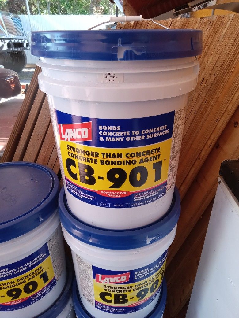 5gallon buckets of Lanco concrete bonding agent. Paid over $88. In store they are brand new .. CB-901 blue / CB-900white . I have 6 buckets left asking 40 per bucket for all