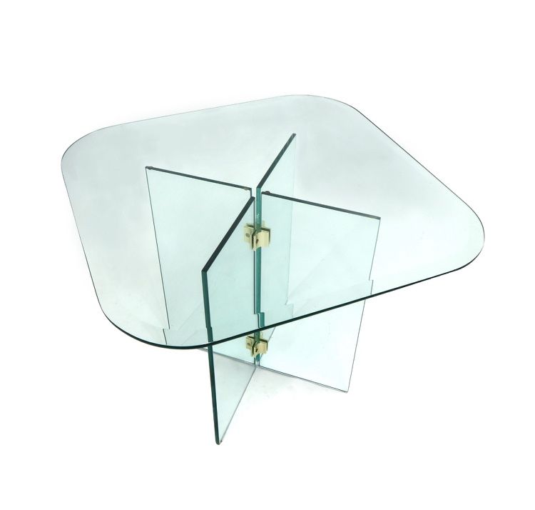 Vintage Mid-century Modern Table “Nineteen-Laties square table with beveled, squircle top glass. The base is formed from thick panels of glass joined by gorgeous brass hardware, signature to Pace. The minimalist table is enhanced only by premium materials and aesthetic acuity. The glass edge transitions between a deep forest to an emerald green depending on the viewing angle. About Pace Collection: The Pace Collection was a high-end contemporary furniture company in business from 1960 to 2001. The company was founded by Irving and Leon Rosen in New York City. The showroom was located in Manhattan on East 62nd Street to offer its fine furniture and services to the contract interior design trade. The Pace Collection advertised in numerous architectural and interior design periodicals. The Pace Collection furniture designs were all distinctly different from those offered by Knoll (company), Herman Miller, Steelcase and other contract furniture companies.” BASE 18.75” Diameter x 20” High Panels 9” wide each Top Glass 45” x 45” In Great Condition w/ minor scratches Bonus - 4 chairs (black metal frame w/ red upholstery) FREE
