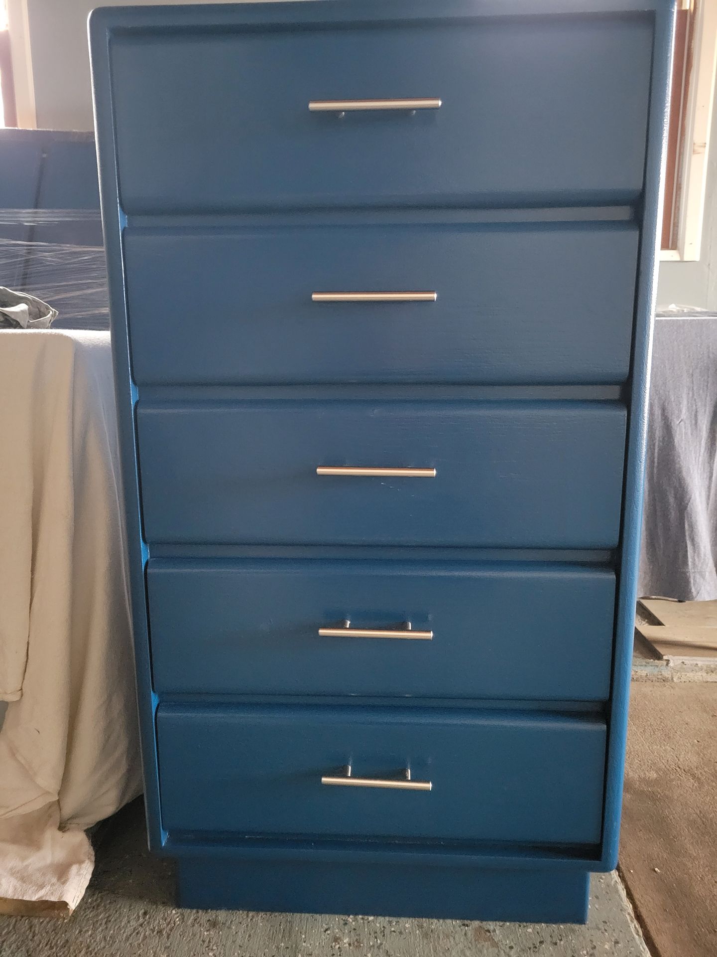 Blue dresser. Totally refinish with blue color and silver Handel Dimensions H45x24x20 Price is firm