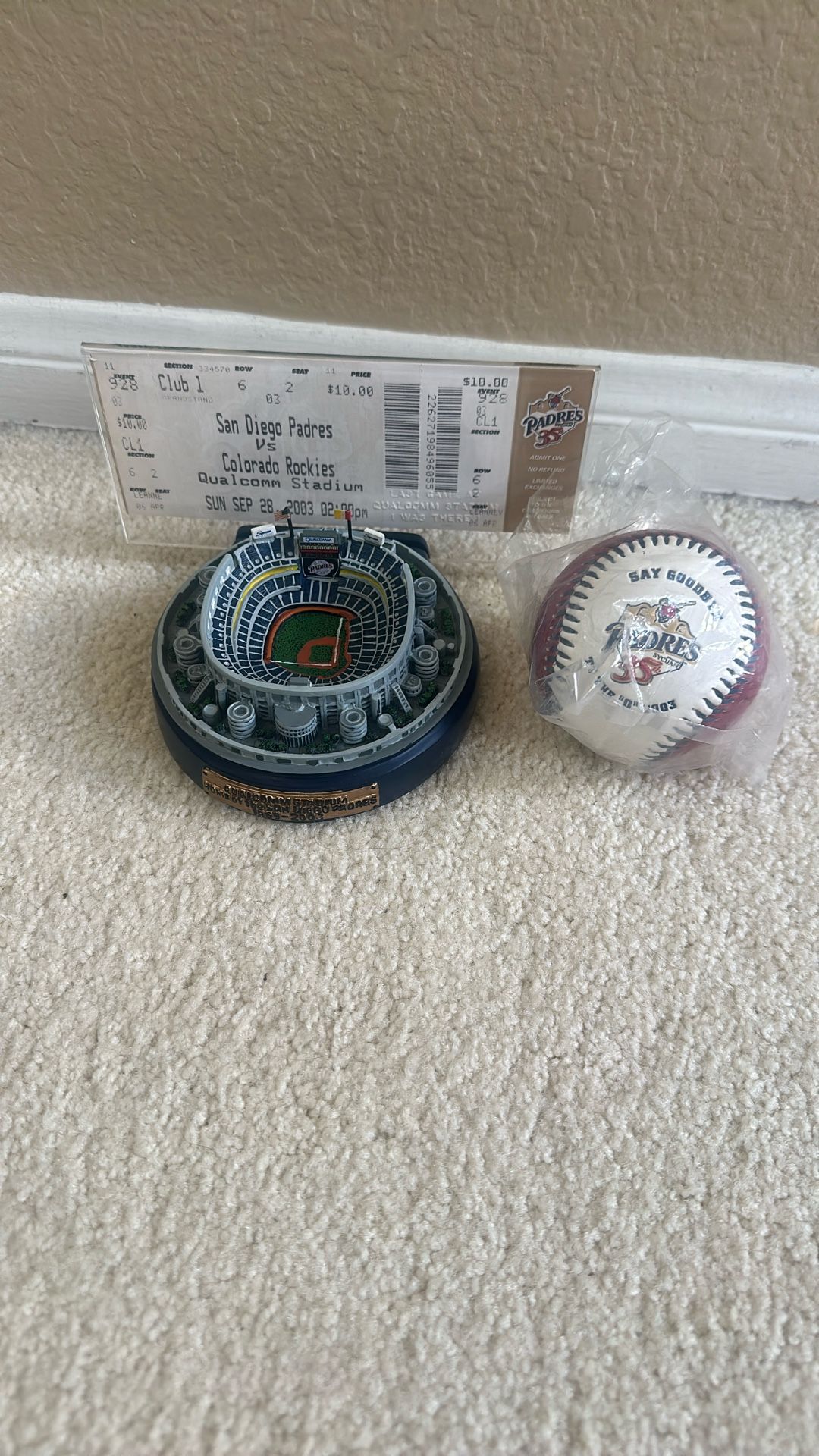 Replica statue of Jack Murphy Stadium/ Qualcomm Stadium. In excellent condition, no box. Game ticket to the final Padres game at Qualcomm Stadium San Diego Padres “Say Goodbye to the Q 2003” baseball All 3 items for $65