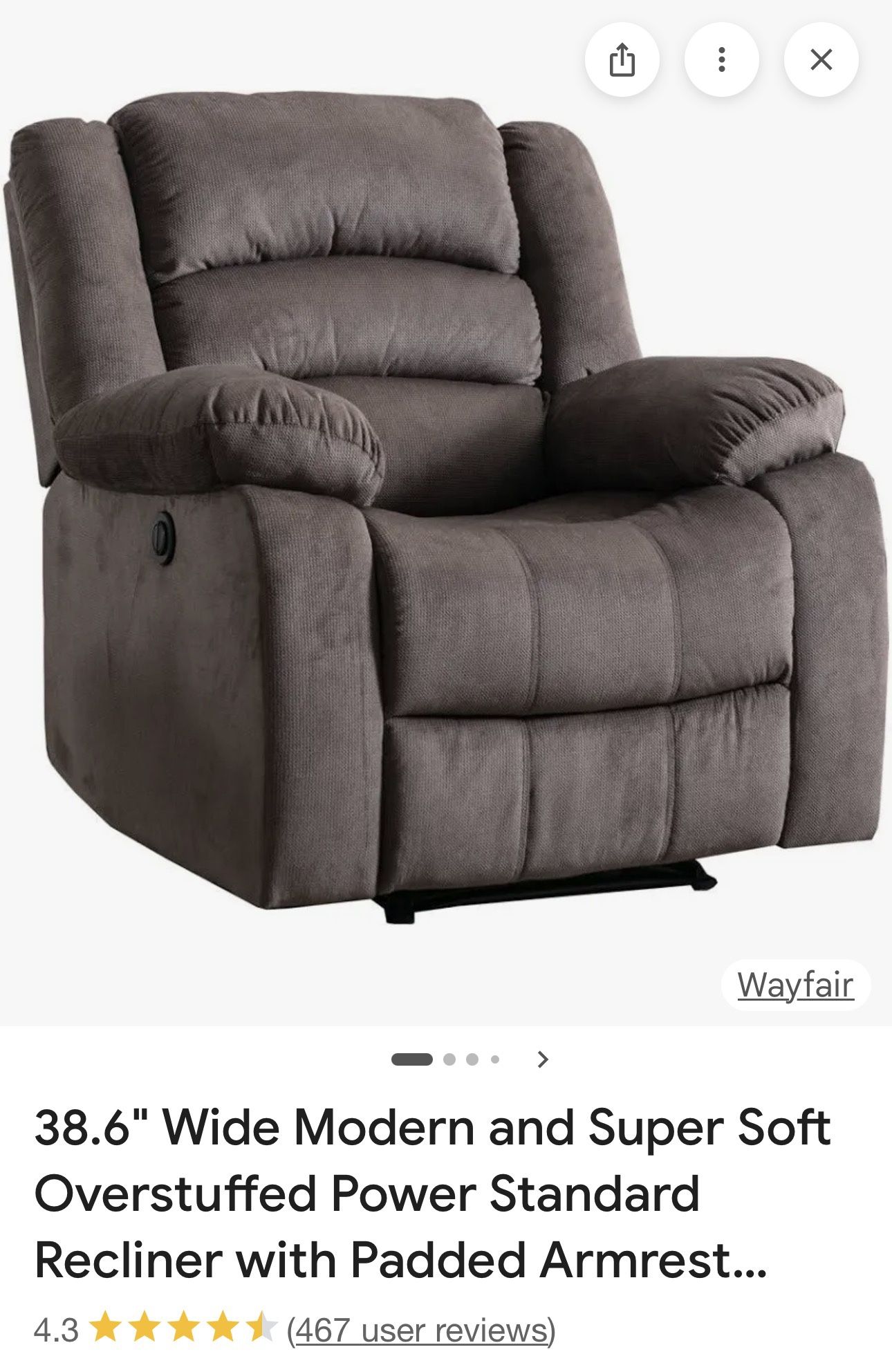 New in box. This was not the color we ordered and it was too expensive to send back. The color is Sandstone-the last photo shows it inside of box. 38.6" Wide Modern and Super Soft Overstuffed Power Standard Recliner with Padded Armrest WAS $580 but is now on sale on Wayfair. Item: 363001 027 $225 meet in Puyallup. I can help you load it up. Three boxes total, so it will fit in a sedan.