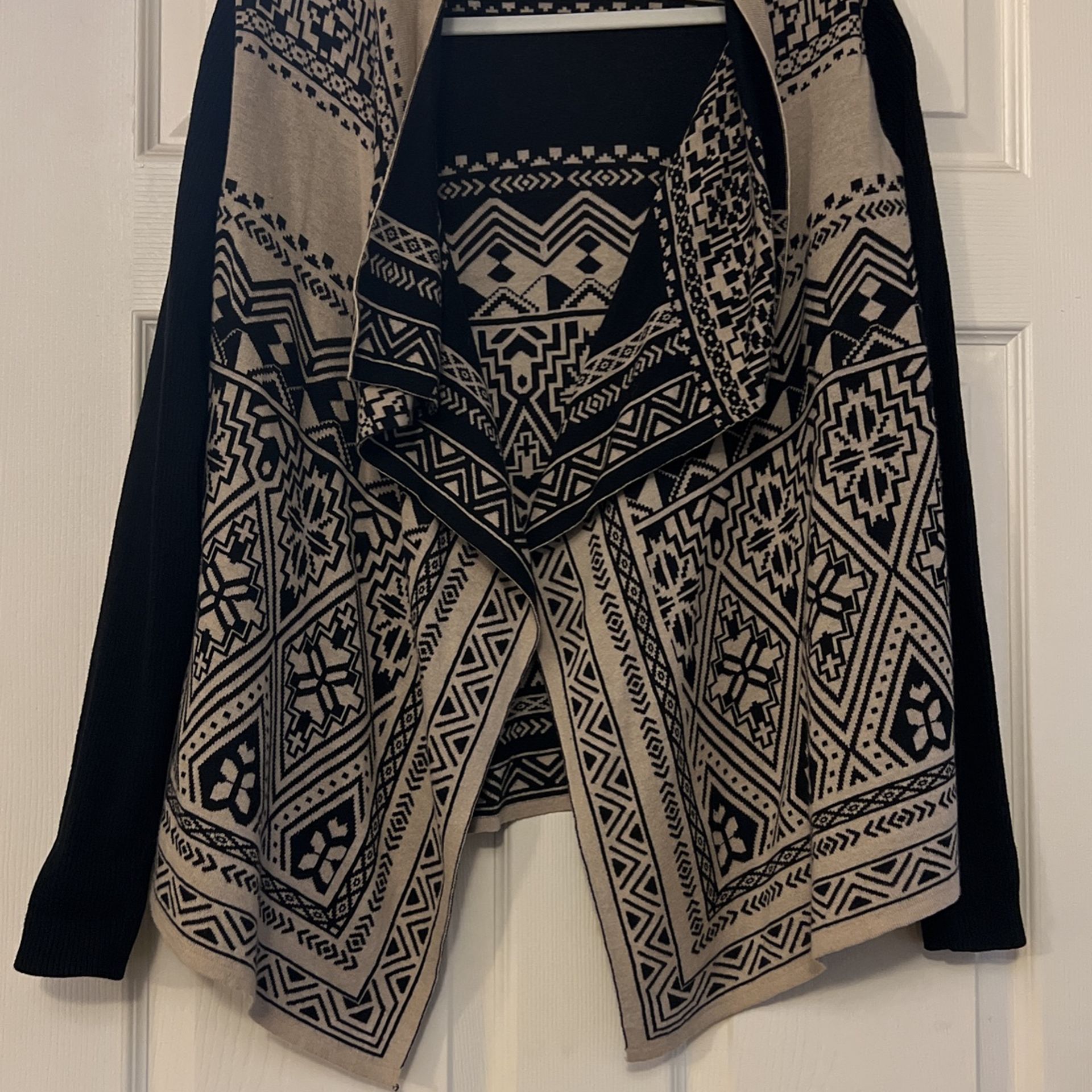 Womens Lucky Brand sweater. Gorgeous beige and black design. Stretchy material on sleeves. Excellent condition. Smoke-free home. $25 cash only please.