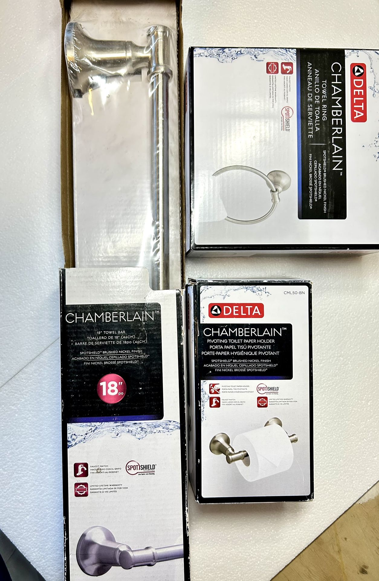18” Towel Bar, Towel Ring, Pivoting Toilet Paper Dispenser - Kit. Brushed nickel finish. By Delta. Retail cost is $100+. Check out my other listings.