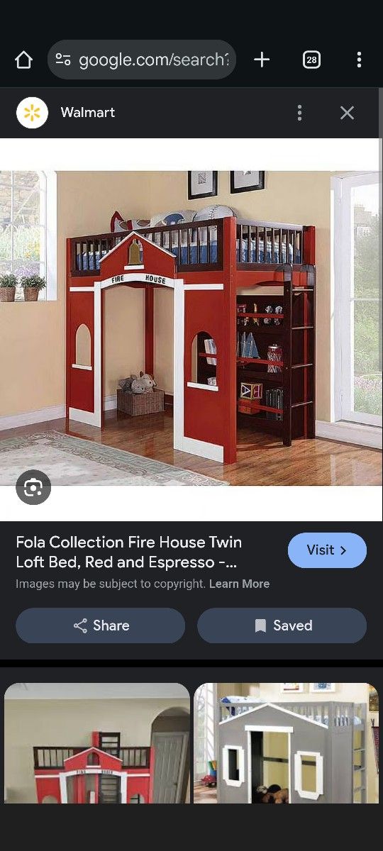 Fireman loft bed with book shelf. Fits twin mattress. We also put another twin at the bottom. Both mattresses are included. Son is too old and needs a big boy bed now. In good condition. Pick up only in Madera.