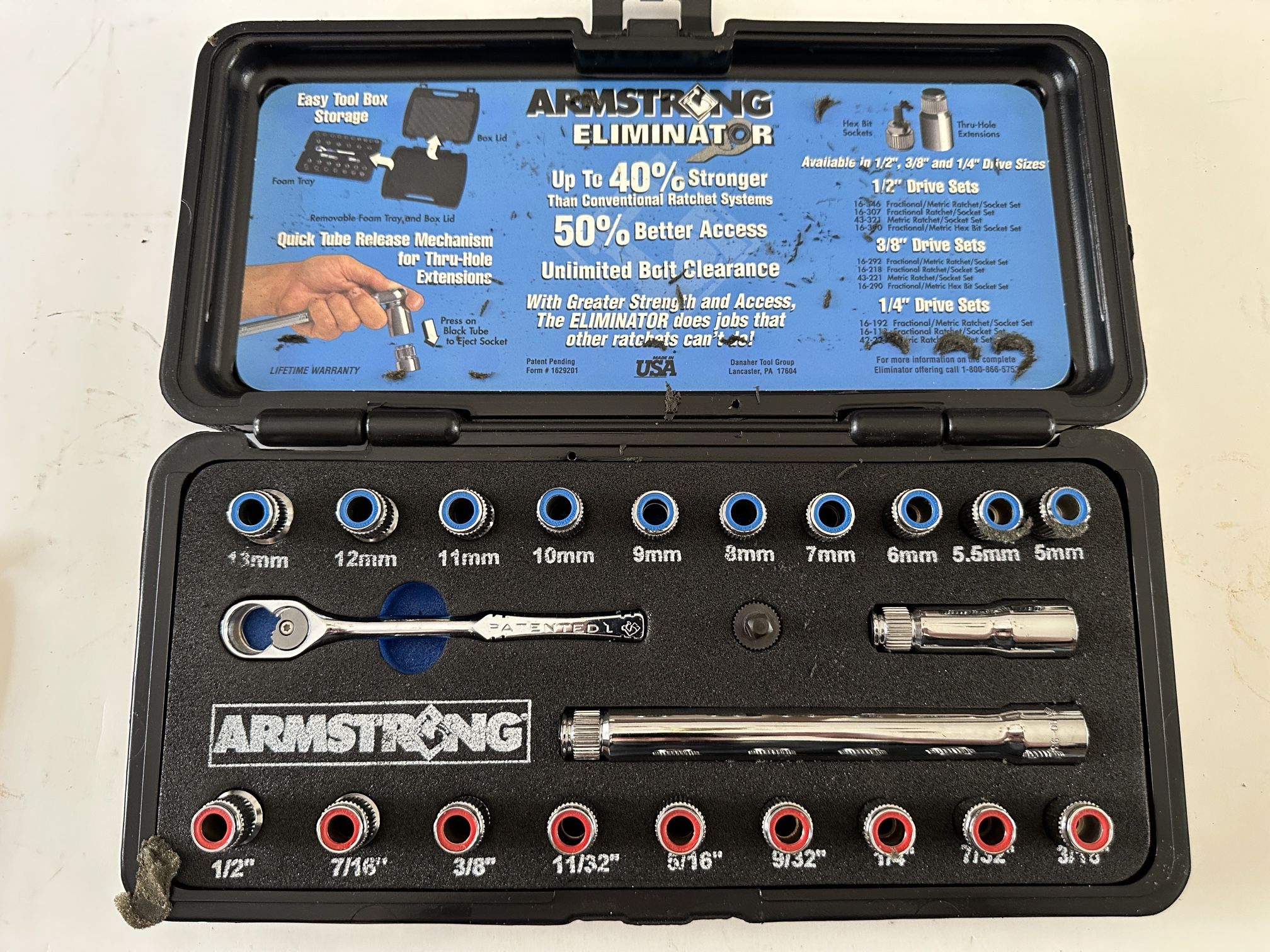 Armstrong Eliminator Metric and SAE Ratchet Set. 23 pieces total. Never used, like new.