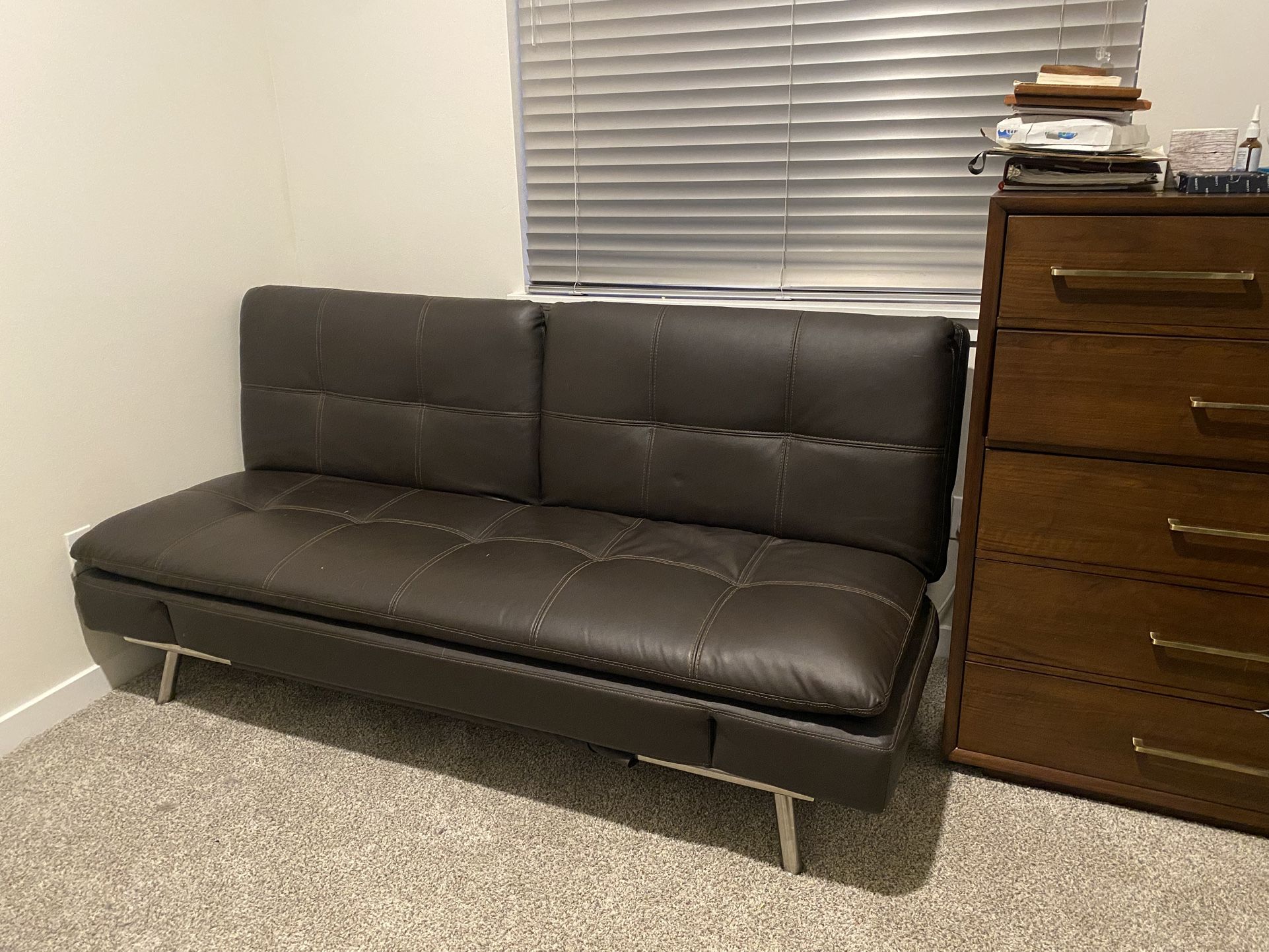 We have moved and picked up new furniture. This is currently sitting in our spare bedroom. Purchased from Costco 2 years ago for $600, currently selling for $750. Please be aware there are some tears (not completely through, but separation in the leather which I’ve noted in the second photo. Used it for guests sleeping over, it’s better quality than most futons! Any questions please ask! Thank you! Features: Material: Bonded leather Kiln dried solid hardwood Stainless-steel frame and legs High density, pillow-top design Two 120V power outlets and two USB ports Patented finger guard safety mechanism Dimensions: Sofa Position: 79.4" L x 38.9" W x 37.7" H The multi-function Ravenna Euro Lounger transforms into a bed, lounger or split-back. Featuring two power outlets and two USB ports so recharging your devices has never been easier. The Ravenna is upholstered in high grade bonded leather that is easy to clean and care for. Find complete comfort and relaxation in the high-density memory foam and pillow-top cushions. The Ravenna is constructed on a kiln dried solid hardwood frame and stainless-steel base and legs for maximum support.