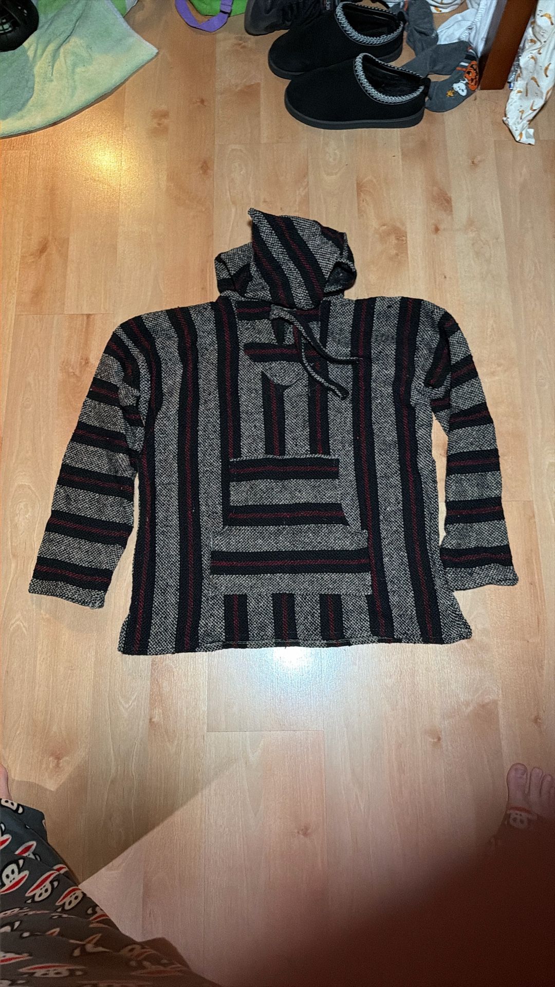 Blsck grey white and red pattern Not sure on the size but based on my size id say a S or M in mens