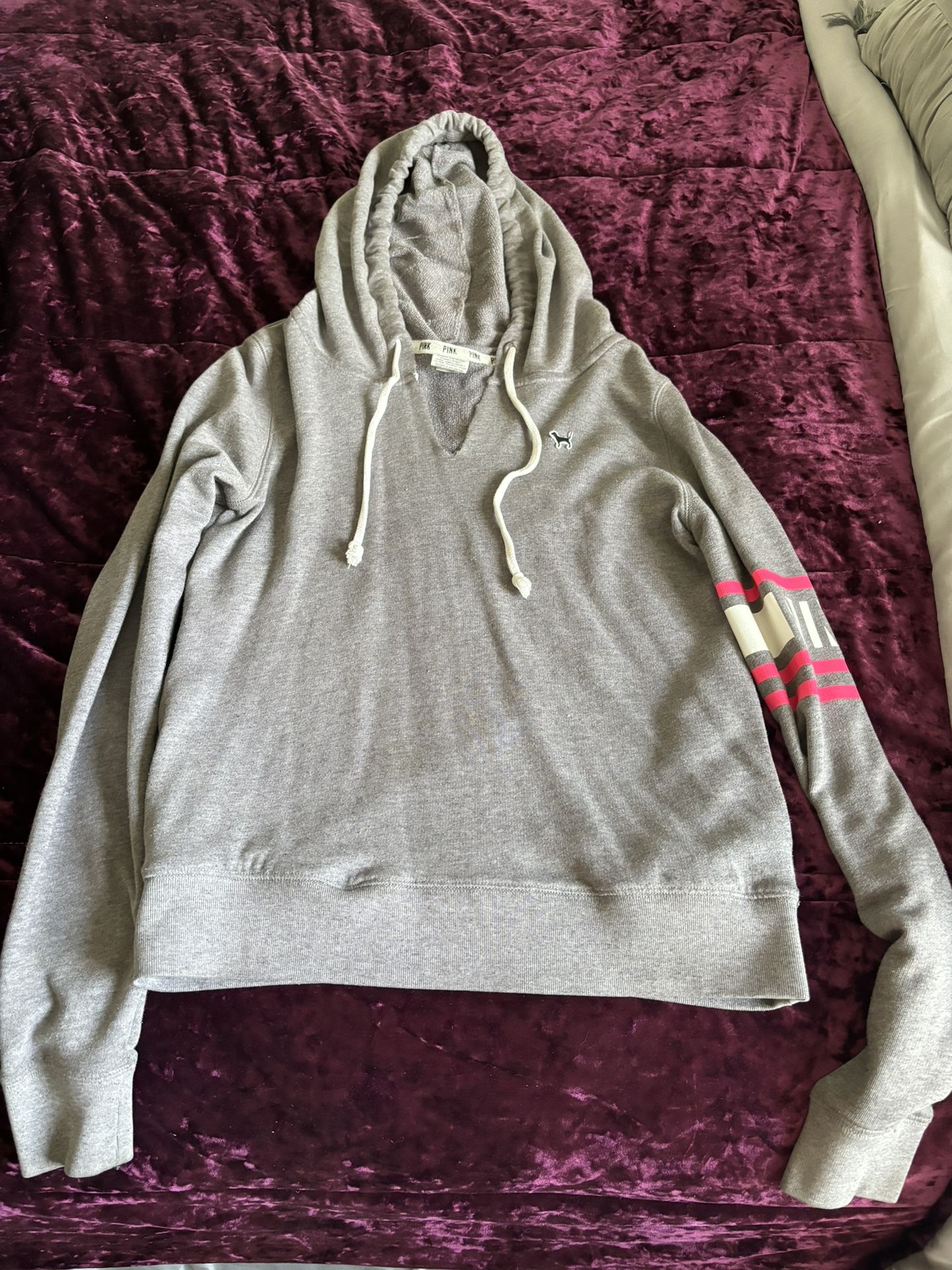 victoria's secret pink. gray hoodie with pink and white writing no stains or holes