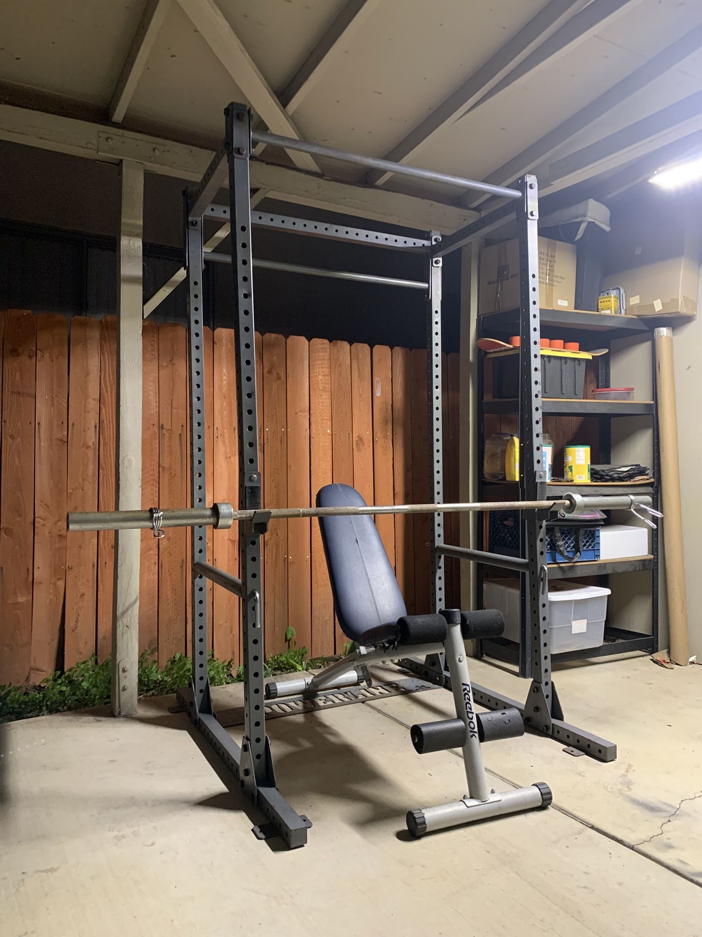Complete home gym set in fair but solid condition with minor surface rust for only $399 price is firm comes with the following items 1-Rack With Pull-Up Bar 2-Safety Pins/Pipes 2-J-Cups 1-Adjustable Bench 1-Olympic Bar 7ft 45lbs With 2 Clips 2-45lbs 2-35lbs 2-25lbs 2-10lbs 2-5lbs Please contact me if interested all sales are final thanks