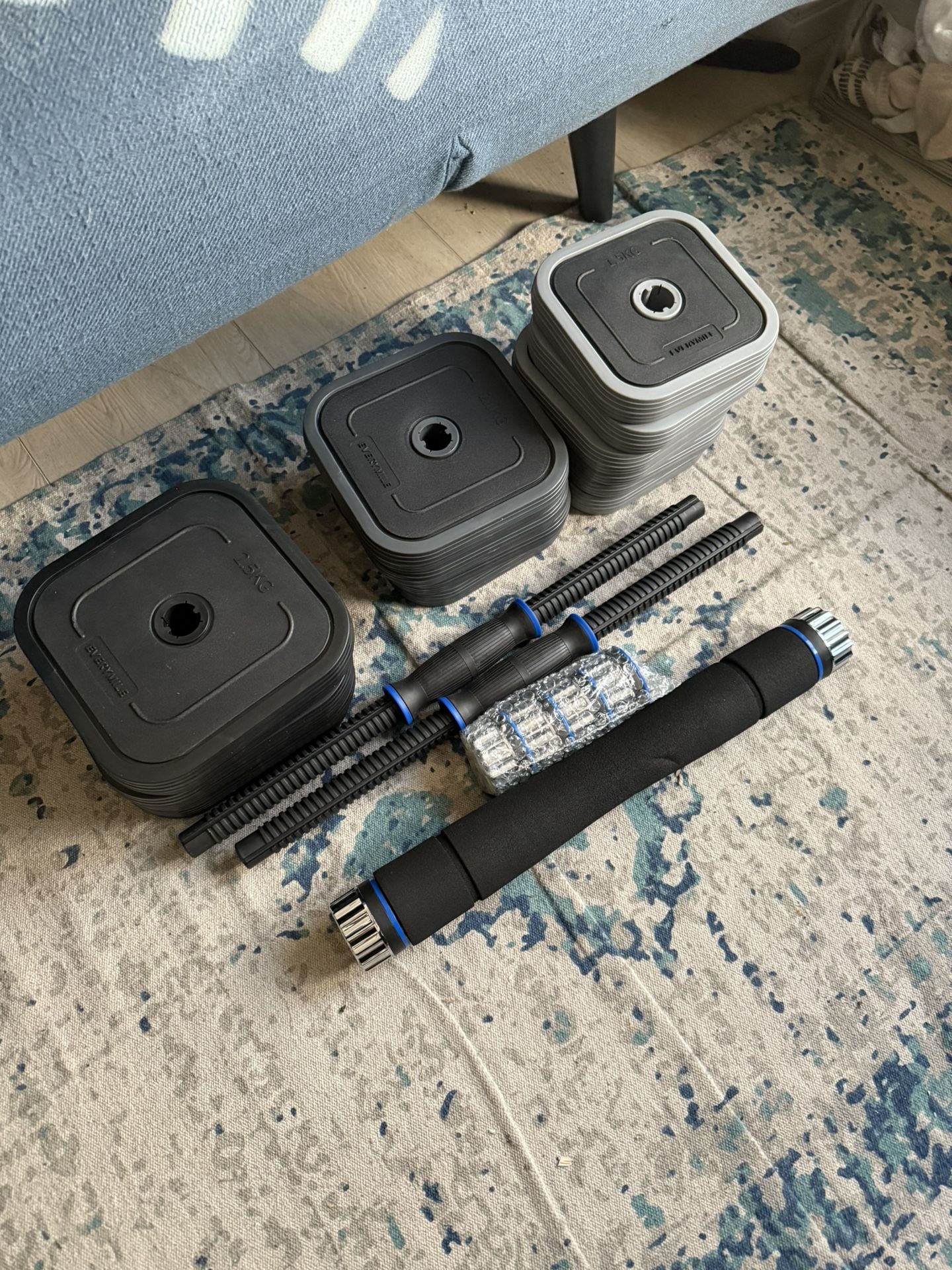 An adjustable dumbbell and barbell set comes with: 2 bars to make dumbells 1 bar to create a barbell 6 1.5 kg weights 4 2 kg weights 4 2.5 kg weights