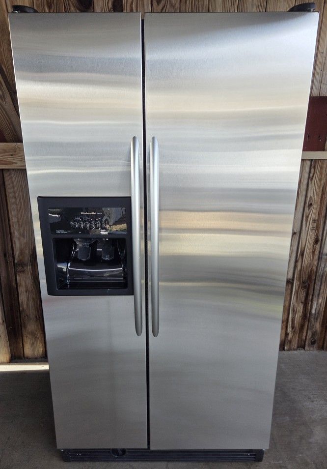 Kitchen AidRefrigerator Side by Side 2 Door Full Size 26 Cu Ft Stainless Steel Energy Efficient Ice/Water Dispenser Fully Functional Warranty Included Delivery & Installation Service Available 1st & 2nd Floor 36 Width 69 Height 32 Depth