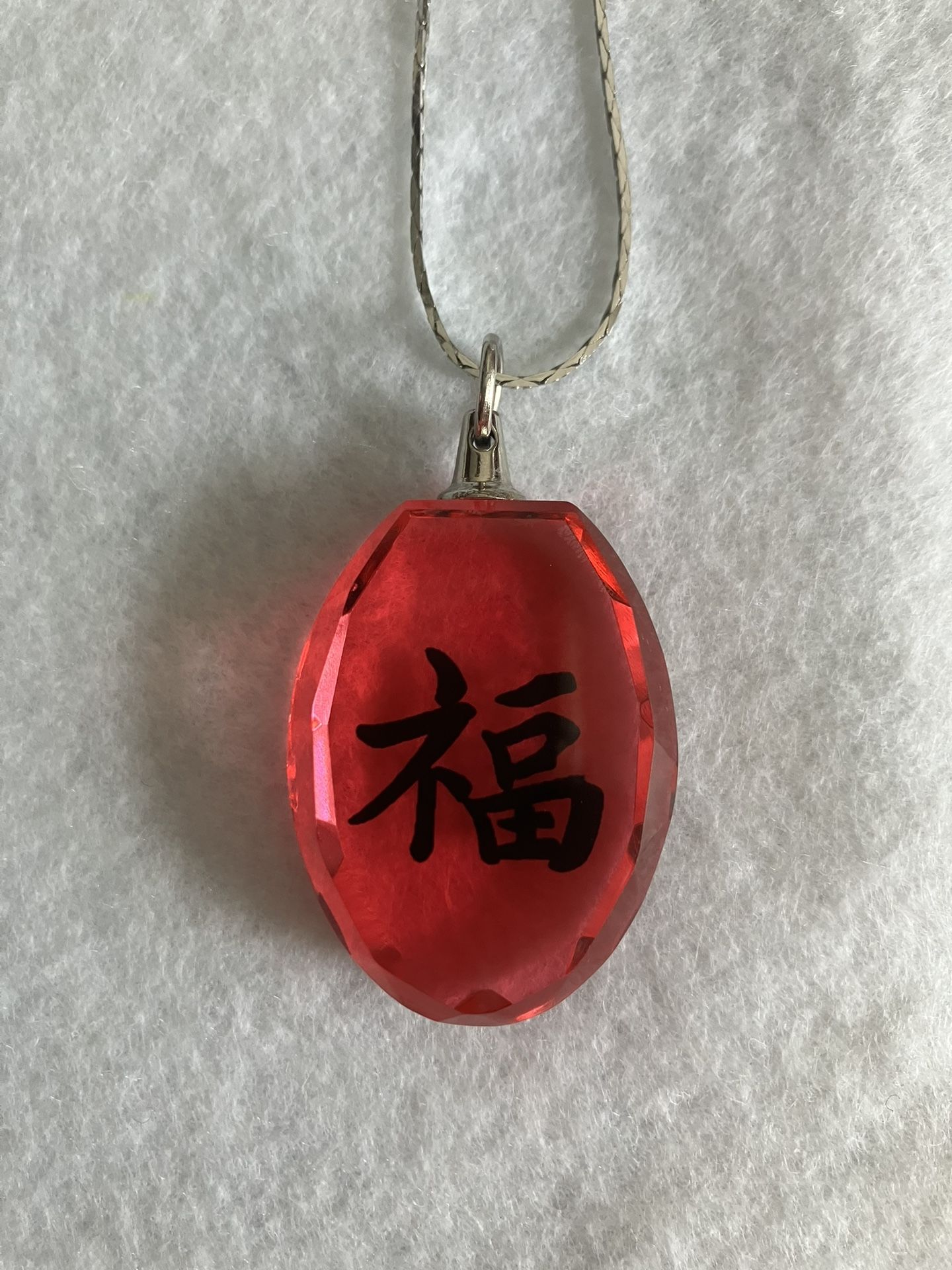 Sterling Silver Necklace And Red Glass With Chinese Symbol Pendant. 24” Long Chain, Pendant 1 1/2” Long x 1 1/8” Wide. Like New. A Gift Box Will Be Included.