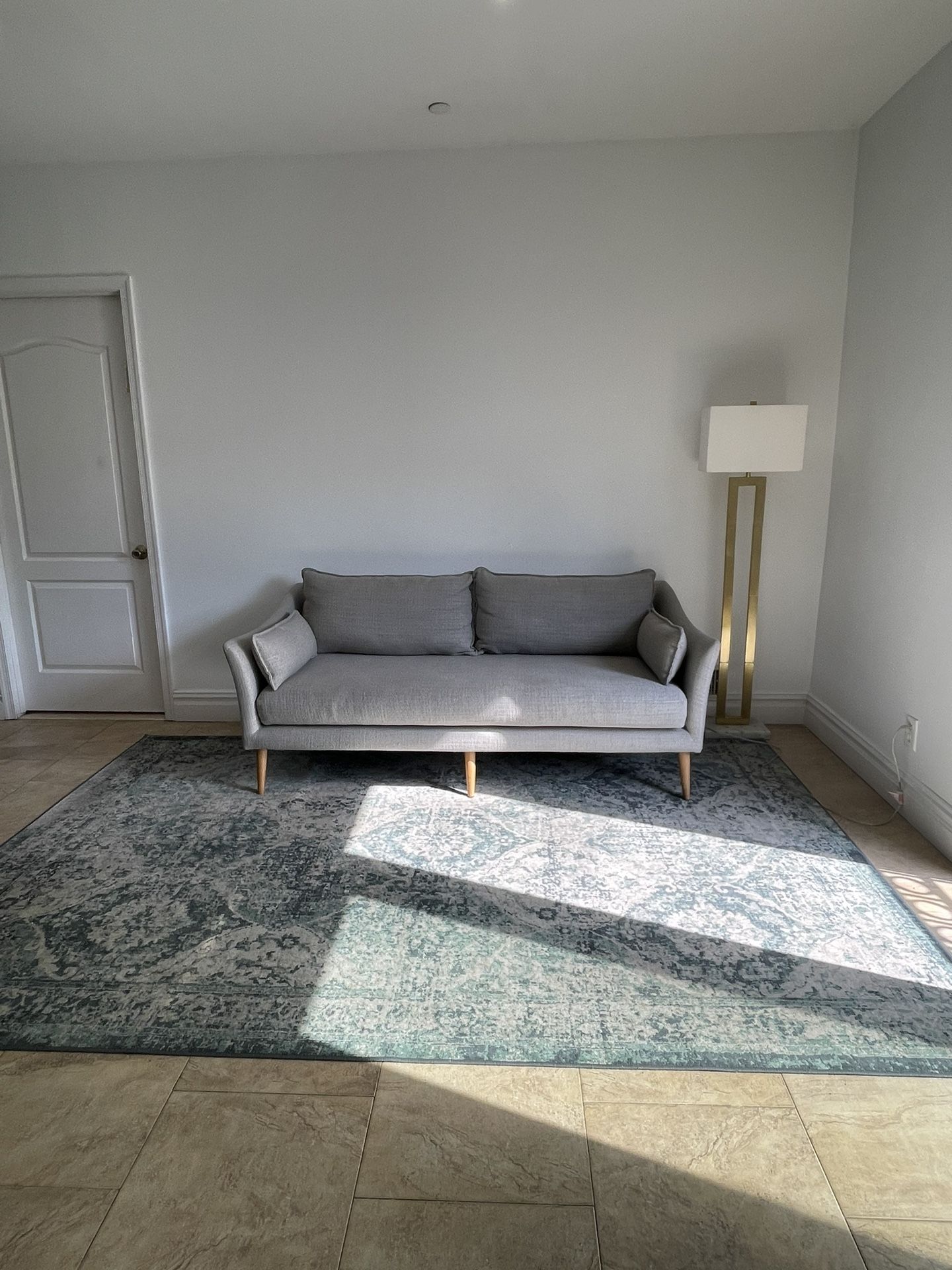 Beautiful West Elm gray couch with vintage blue rug. Selling this set for $400. Dimensions for couch: W72” x D29” Dimensions for rug: 6.5ft x 10ft These can be purchased separately Couch: $300 Rug: $100