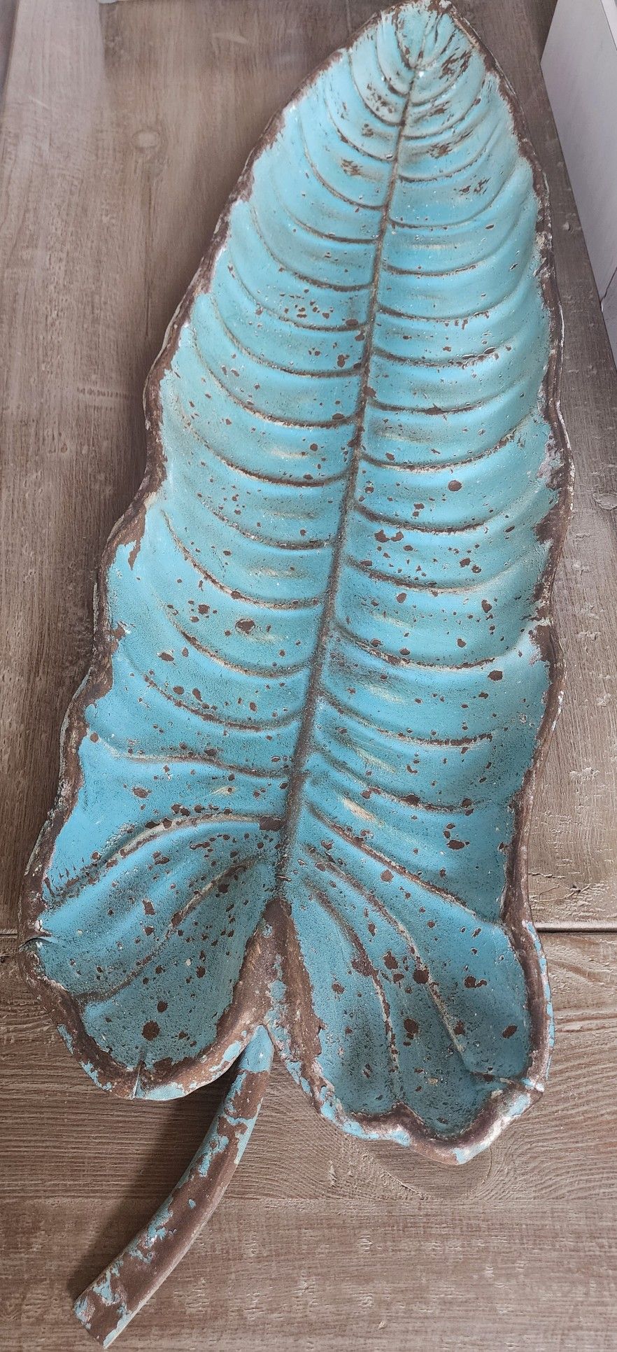 Teal Blue Rustic Metal Leaf Tray 35.5 inches long 10.5 inches at widest point