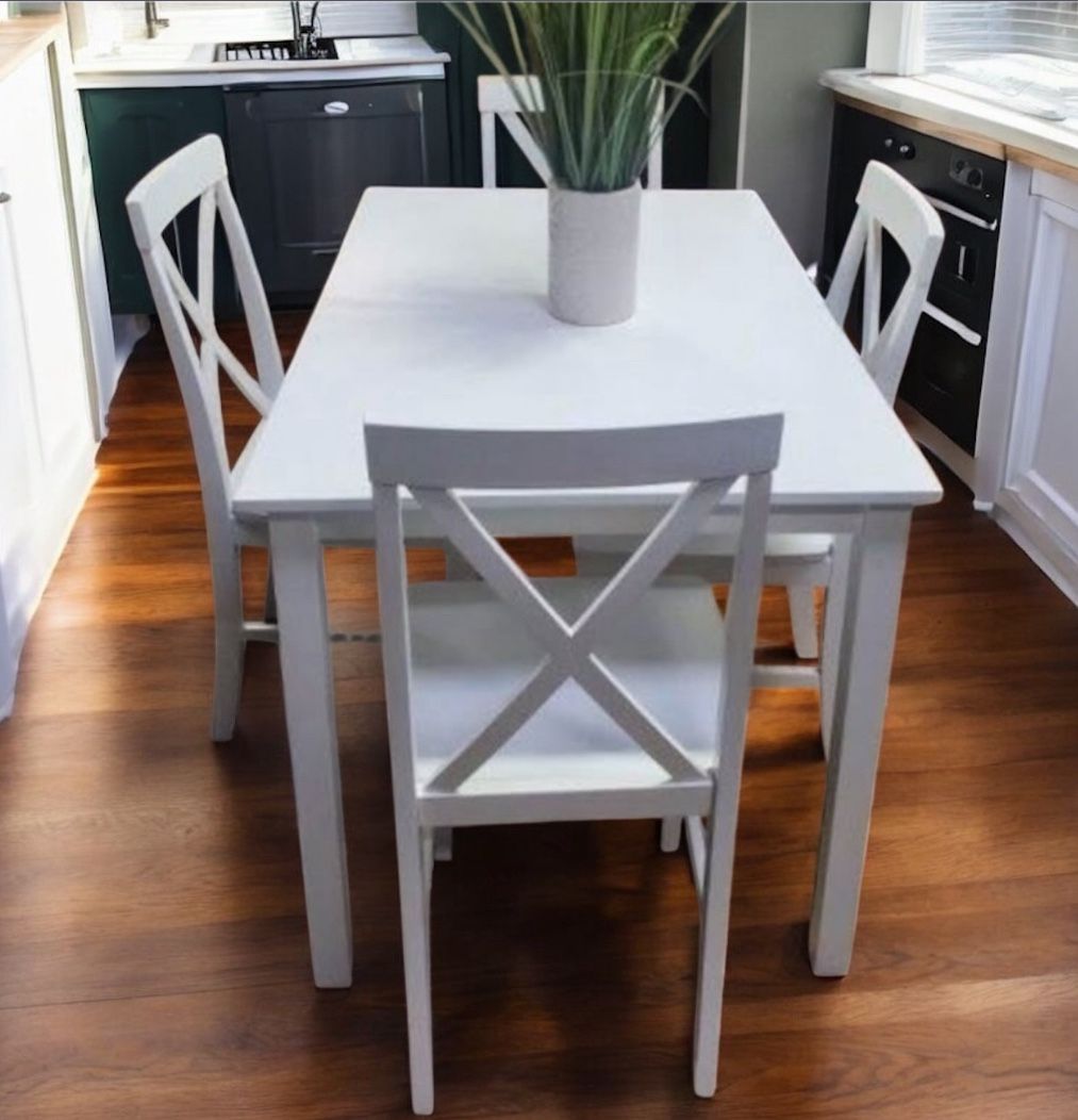 New 5 Piece Contemporary White Farmhouse Dining Set Table Dimensions: 47" L x 30" W 30" H Chair Dimensions: Height: 36” H x 16” W x 19” D Seat Dimensions: 16.75” H x 16.125” W x 14.75”D Backrest Dimensions: 19.25” H x 14.75” W Verified and Trusted Seller - See/Read My Reviews
