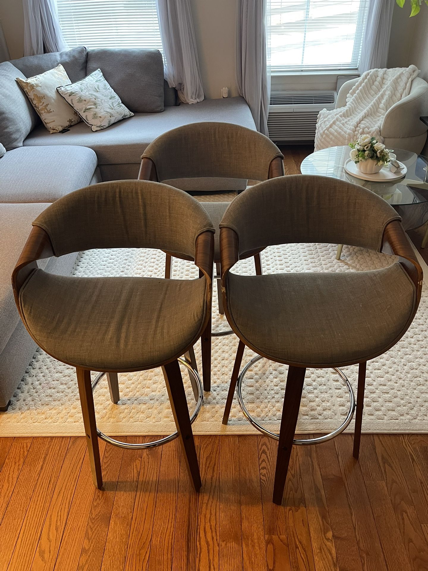 Three (3) LumiSource Curvini mid-century modern counter stools with walnut finish and light grey fabric upholstery. Original price on Wayfair is $489.99 for a set of two (2) Slight wear on the sides, but nothing a good wood stain can’t fix.