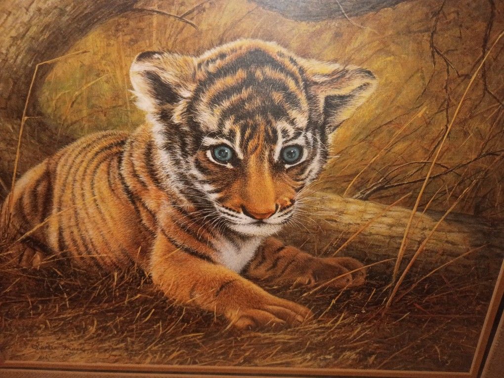 "Tiger Cub". Original professional print with original frame and paperwork from "House of Frames". Signed in pencil on bottom corner by the artist Charles Frace. The Print itself, the glass & wood frame are all in excellent condition! Woven border design. 21.5" H x 24.5 W, total size including frame. 18" Wx14.5"H with out frame. Also includes..original papers dated 1975, with a small message signed by Charles Frace, in marker. Large sized 21"x17" original paper, two paged booklet, as shown in pictures. Large transparent paper meant for protection. Please see all pictures in full size for condition and size visuals. Local meet, cash or cash app. Feel free to reach out with any questions. Asking $25 or best offer. Thank you!!