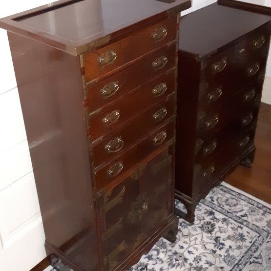 Selling a set of early-mid 20th Century rare vintage Korean Chest of Drawers. These chests are beautiful! They appear to date from the early to mid 20th century. They have been in my possession since the 1990s. The wood working and quality is exquisite, and the bronze hardware make them truly amazing. They are made from solid wood, no plywood. I have used them as a dresser and for keepsakes all these years. One is more upright, with smaller drawers, and a larger cabinet underneath. The drawers (except the top drawer) have dividers inside, making multiple “compartments” if you will. So, the top drawer has one compartment, the second drawer has two compartments, etc. All of these drawers are lined with fabric. The door on the cabinet is missing one of the decorative bronze rings. Other than and a few scratches from use and age, it is in wonderful condition. Approx Dimensions: 18” x 14” x 45” The wider, shorter “dresser” has 5 un-lined drawers of equal size. There was once a latch that went to the top drawer that has detached, but other than that and some scratches from use and age, it is also in wonderful condition. Approx Dimensions: 24” x 12” x 38” These beautiful chests will give their new owners a lifetime of service and enjoyment! Located in storage near 710 and 91 freeways. Pick up only