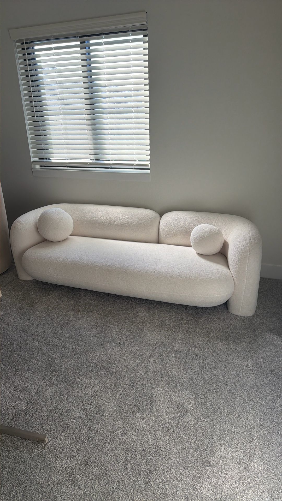 Lounge Couch in White is a statement piece that embodies modern elegance and comfort. Fully upholstered in luxurious soft white fabric, this couch exudes a sense of sophistication and tranquility. Its unique design features a round seat that invites relaxation, while the back and sides flow seamlessly into gently sloping armrests, creating a cocoon-like shape. Perfect for both contemporary and minimalist interiors, the Nido Lounge Couch White offers a cozy yet stylish seating experience, ideal for lounging in style.