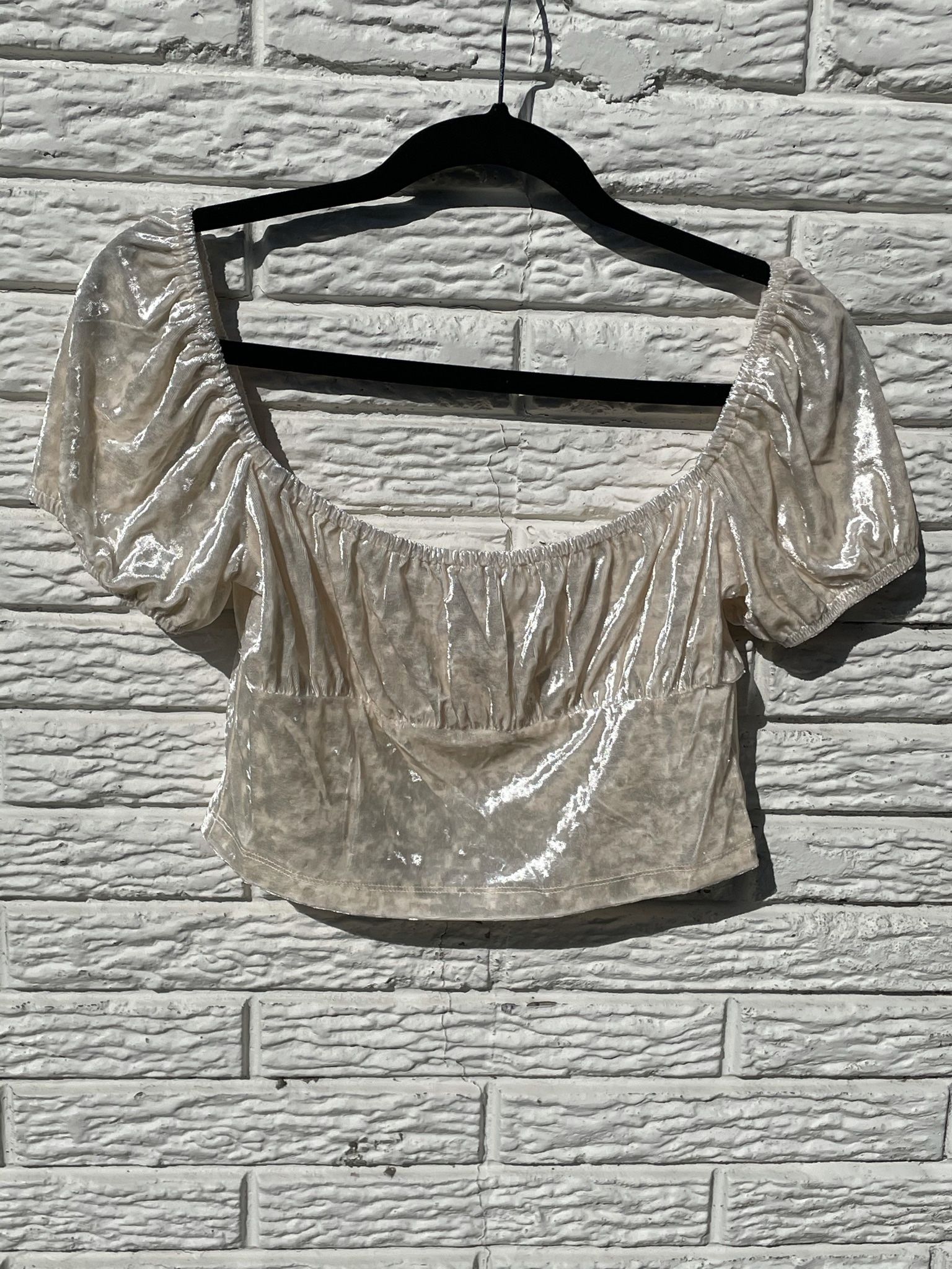 Pearly white stretchy material with soft velvet fabric. Perfect for the holidays! I have sizes small, medium, and large.