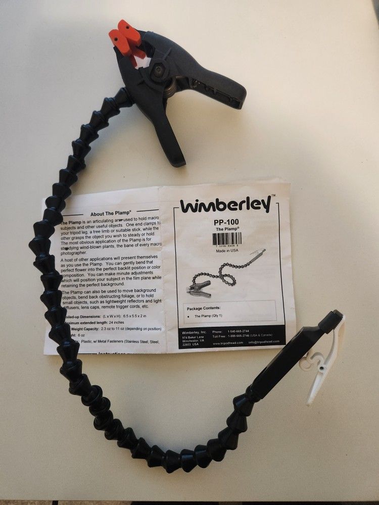 Wimberly Plamp PP-100. Pony #3251. Excludes camera. Also selling 5 in 1 reflector (2 feet) for $20. Perfect combination together. The Wimberley PP-100 is a articulating arm, commonly known as "The Plamp," used in macro photography to hold and position subjects like plants. It attaches to a tripod with one clamp and holds a subject with a smaller clip at the other end. The Plamp is designed to stabilize windblown subjects, move them into a desired position, or hold accessories like reflectors and diffusers.