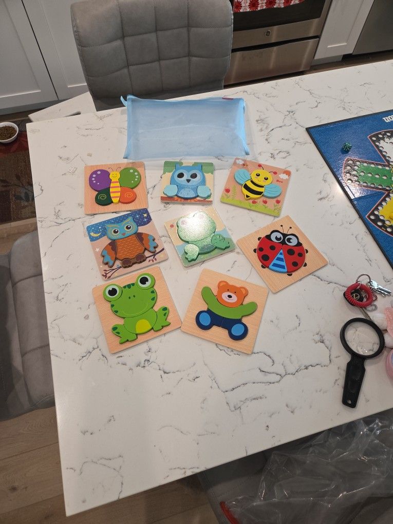 GIGGLE SCAPES 8 WOOD ANIMAL PUZZLES WITH ORIGINAL ZIP BAG FOR STORAGE. IN GREAT CONDITION. LOOK AT ALL THE PICTURES I'VE INCLUDED