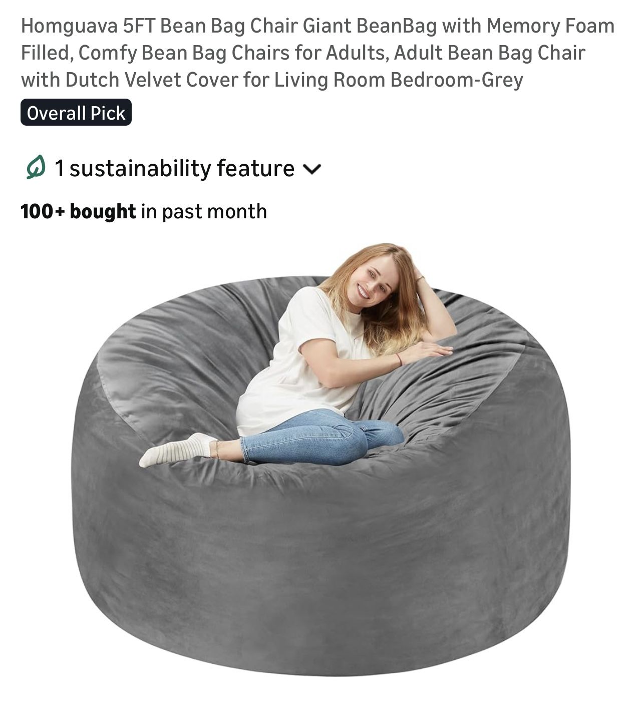 5 Foot giant Gray memory foam filled bean bag chair. Barely used